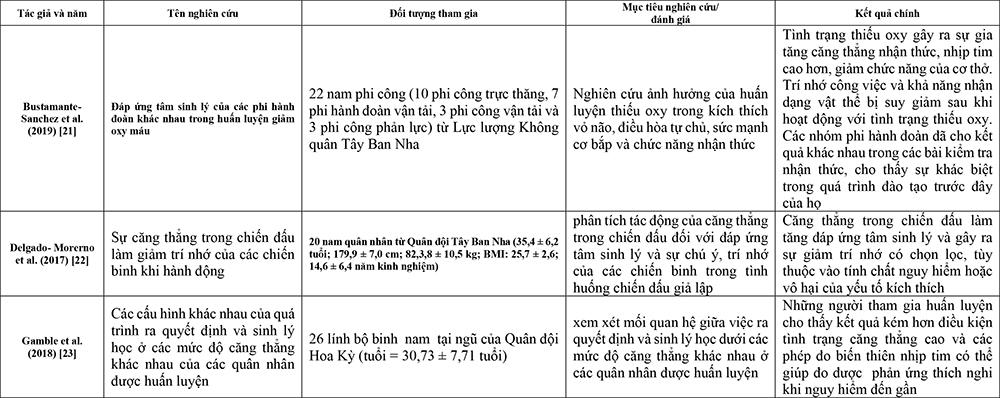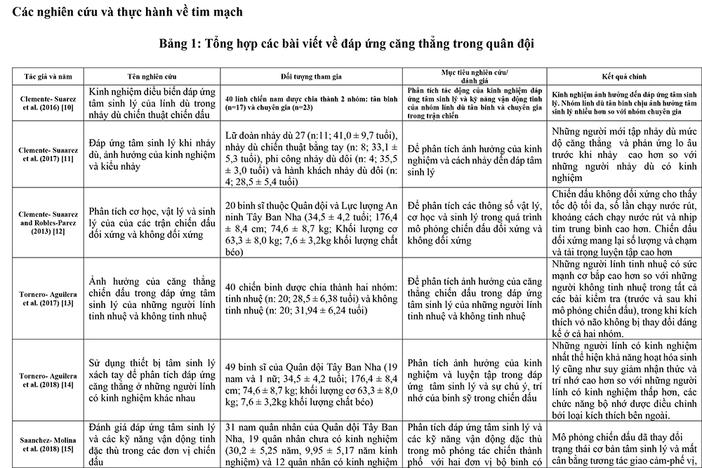 Một số nghiên cứu đã phân tích phản ứng căng thẳng, chủ yếu thông qua bảng câu hỏi, nhịp tim (HR) hoặc sự biến thiên nhịp tim (HRV) trong quân nhân. Trong tất cả các trường hợp, các chỉ số HR và/hoặc HRV đã được đưa vào để đánh giá mức độ căng thẳng. Hầu hết, sử dụng nam giới là đối tượng nghiên cứu, mặc dù trong ba trường hợp [14, 16, 17] binh sĩ nữ cũng được khảo sát. Phương pháp chuẩn hóa sử dụng phần mềm chuyên biệt phân tích chỉ số HRV được sử dụng trong hầu hết các nghiên cứu. Trong phần lớn các nghiên cứu được chọn, đáp ứng với căng thẳng được khảo sát trong các chiến dịch hoạt động trên bộ là chủ yếu, ngoại trừ một nghiên cứu tập trung vào các phi công quân sự (trong nghiên cứu này chỉ số HR và chỉ số căng thẳng của phi công quân sự tăng lên sau khi các phi công tham gia diễn tập bằng máy bay phản lực [18]) và bốn nghiên cứu về binh lính nhảy dù [10, 11, 19, 20].