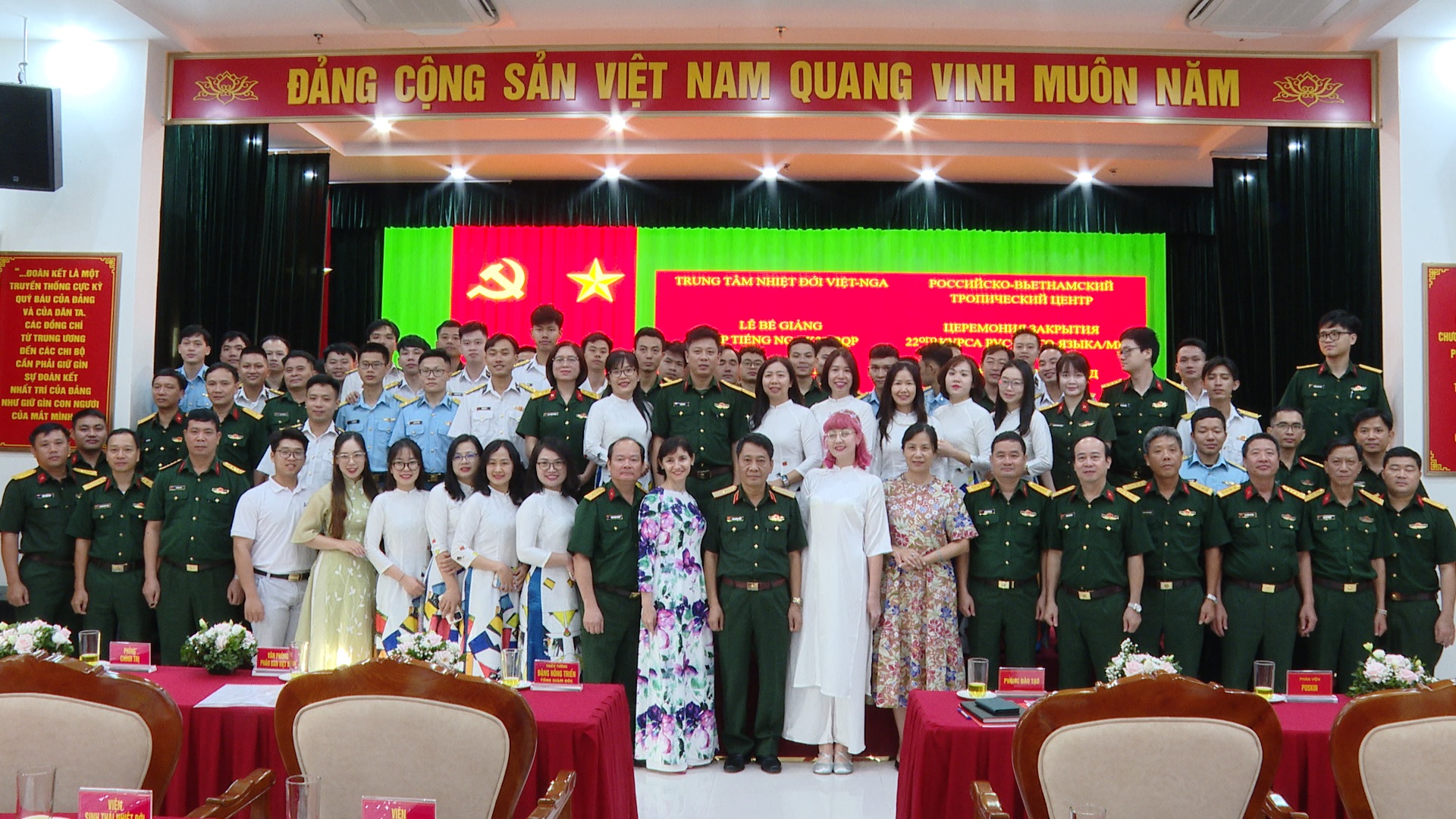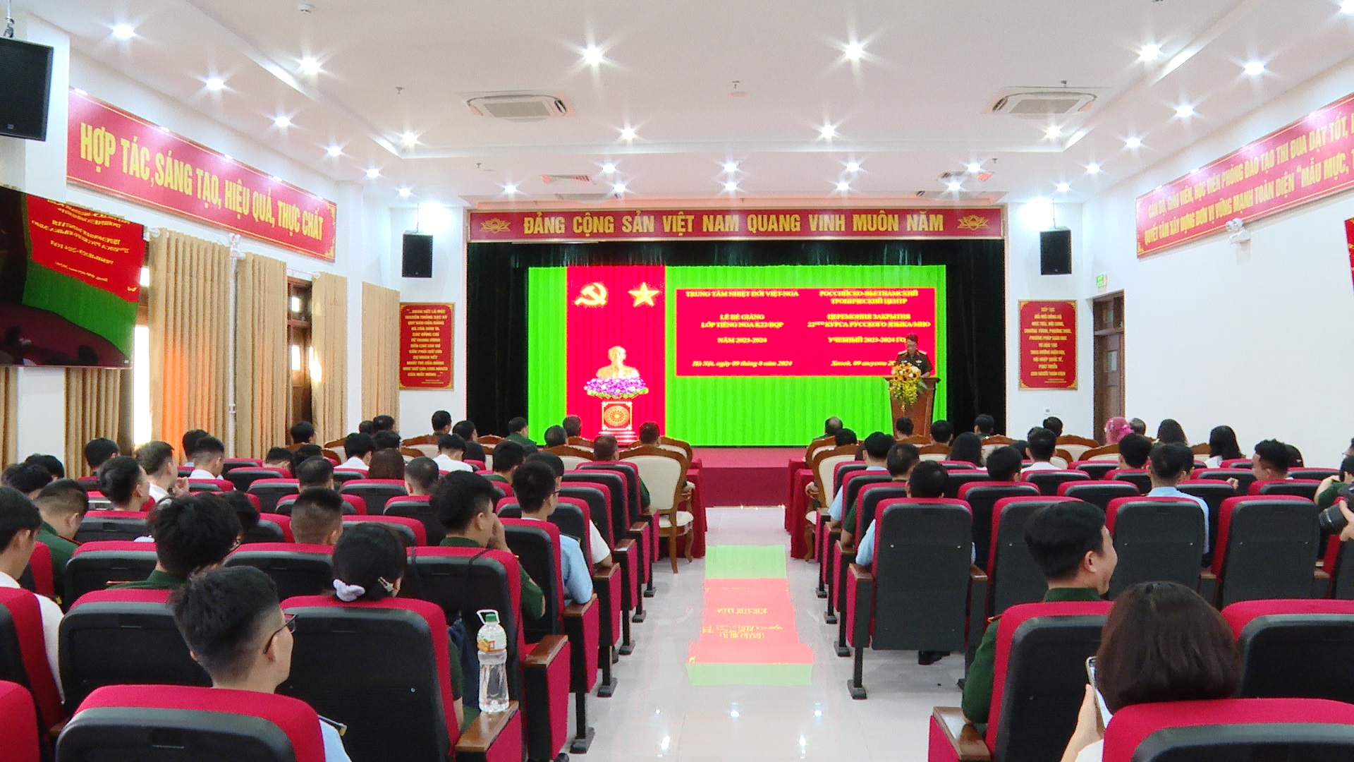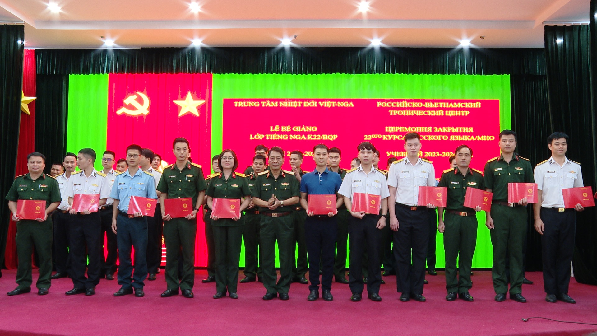 13/08/2024Chiều 09 tháng 8, tại Hà Nội, Trung tâm Nhiệt đới Việt - Nga (Trung tâm) tổ chức Lễ bế giảng khoá bồi dưỡng tiếng Nga K22, năm học 2023 – 2024 theo chỉ tiêu của Bộ Quốc phòng giao. Đồng chí Thiếu tướng, TS. Đặng Hồng Triển, Tổng Giám đốc Trung tâm chủ trì Lễ bế giảng. Tham dự có đại biểu lãnh đạo, chỉ huy các cơ quan, đơn vị tại Cơ sở chính và cán bộ, giáo viên, học viên thuộc Phòng Đào tạo.