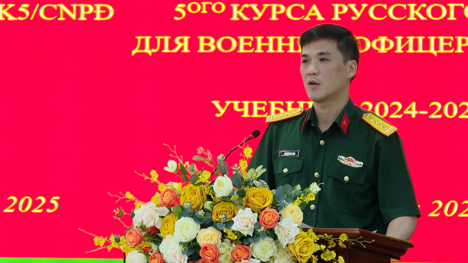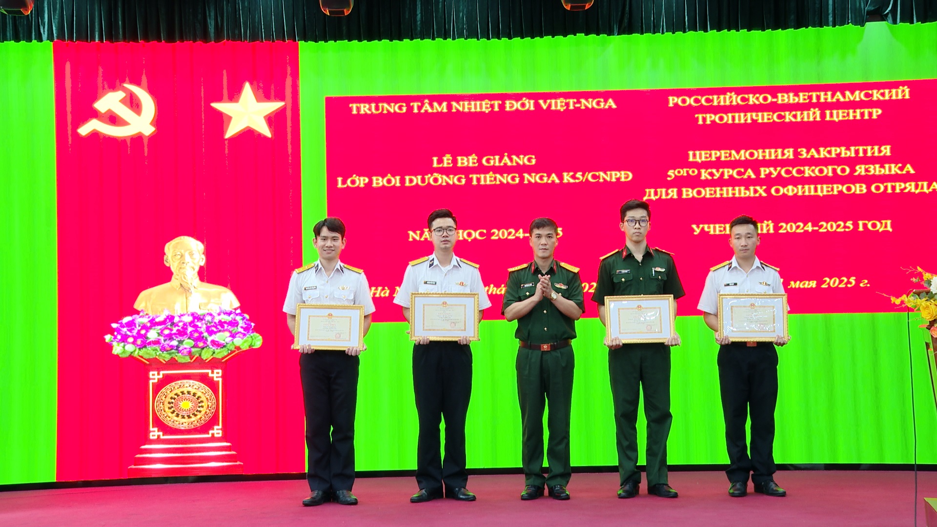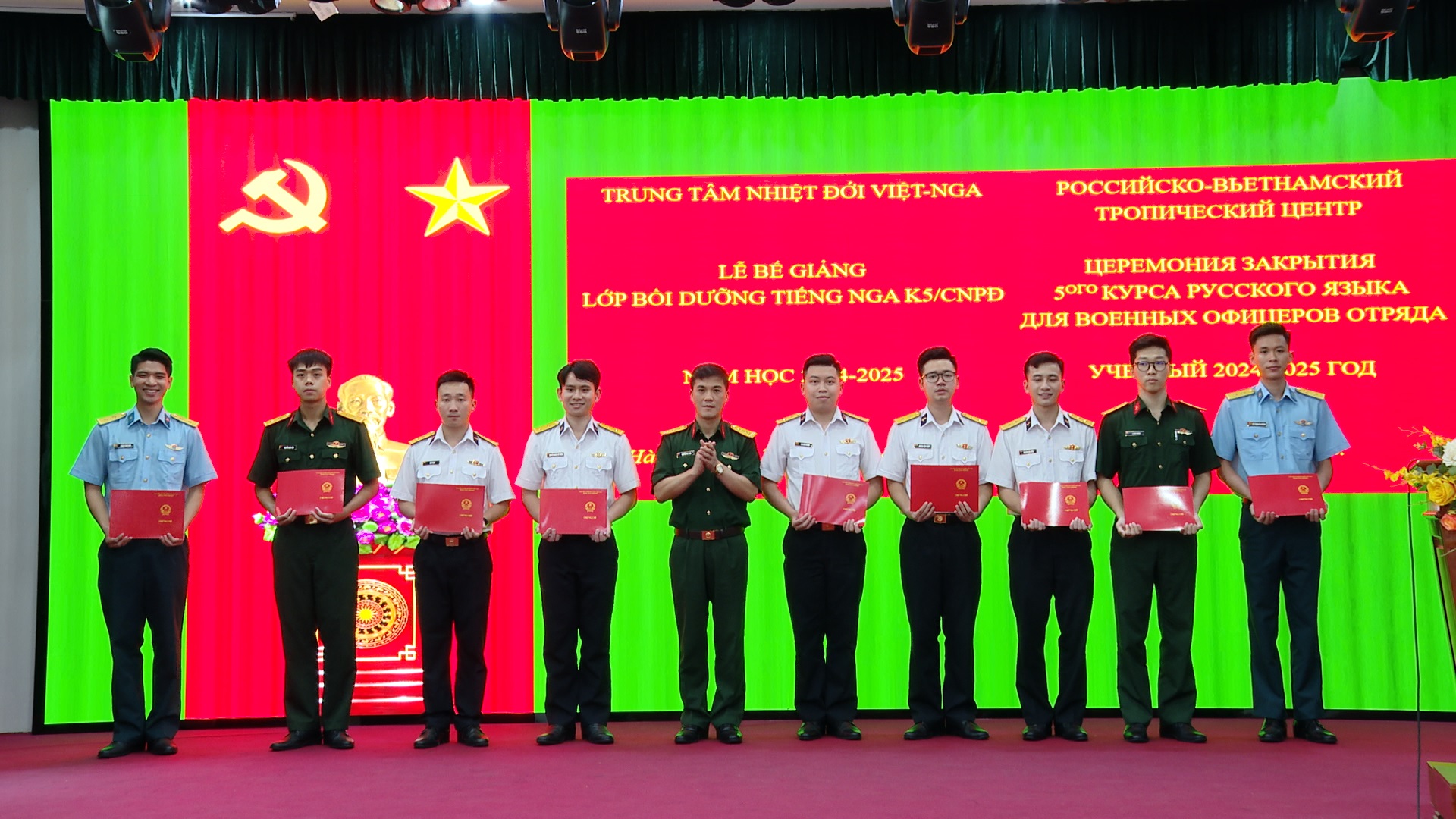 22/05/2025Chiều ngày 22/5, tại Hà Nội, Trung tâm Nhiệt đới Việt - Nga tổ chức Lễ Bế giảng Lớp bồi dưỡng tiếng Nga khóa 5 trình độ bậc 3 (B1) khung Châu Âu, năm học 2024 - 2025 cho 18 cán bộ, sĩ quan tốt nghiệp cử nhân quân sự cấp phân đội (K5/CNPĐ). Đồng chí Đại tá, Tiến sĩ Nguyễn Phi Long, Phó Tổng Giám đốc Trung tâm chủ trì buổi Lễ. Tham dự buổi Lễ có các đồng chí đại biểu đại diện lãnh đạo, chỉ huy một số cơ quan, đơn vị tại Cơ sở chính cùng toàn thể giáo viên và học viên K5/CNPĐ.