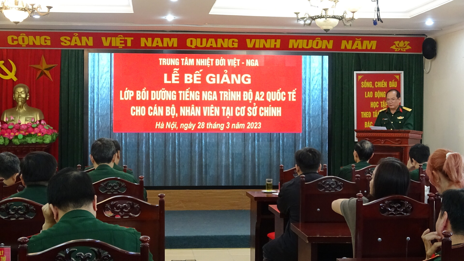28/03/2023Chiều 28/3/2023, tại Hà Nội, Trung tâm Nhiệt đới Việt - Nga (TTNĐ Việt - Nga) tổ chức Lễ bế giảng lớp tiếng Nga trình độ bậc 2 (A2) quốc tế cho cán bộ, nhân viên Trung tâm tại Cơ sở chính. Đồng chí Thiếu tướng Đặng Hồng Triển, Tổng Giám đốc Trung tâm dự và phát biểu tại buổi lễ. Tham dự buổi lễ có Thủ trưởng Ban Tổng Giám đốc, đại diện chỉ huy các cơ quan, đơn vị tại Cơ sở chính, cùng giáo viên và học viên lớp tiếng Nga.