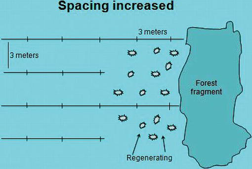 Thay đổi khoảng cách trồng theo thực tế của từng cảnh quan hay khu vực có nghĩa là cho phép tăng cường trồng cây con cho các địa điểm thực sự cần sử dụng phương pháp này. Do đó, việc thay đổi khoảng cách có thể làm giảm từ 1100 cây con trên mỗi ha (ở khoảng cách 3 × 3 m) xuống một nửa hoặc thậm chí một phần ba con số đó, điều này thoạt nghe có vẻ như làm giảm nhu cầu về cây con, nhưng khi xem xét rằng việc sử dụng ít cây giống trên mỗi ha có thể phục hồi nhiều ha hơn, nhìn chung, việc sản xuất và thương mại hóa cây giống có thể bị ảnh hưởng ít hoặc không bị ảnh hưởng gì cả.
