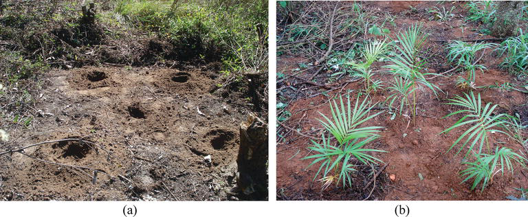 Hình 5. a) Hố trồng cây “hạt nhân”. b) Cây con trong kỹ thuật trồng cây “hạt nhân” làm giàu. Dự án phục hồi rừng LARF-UFV. Ảnh: Sebastião Venâncio Martins.
