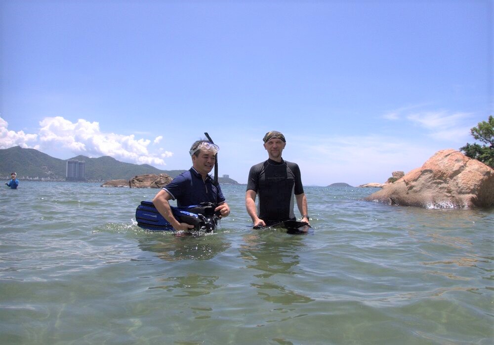TS Phạm Duy Nam và GS Konstantin Tkachenko khảo sát Hòn Chồng, ngày 20/7/2023.