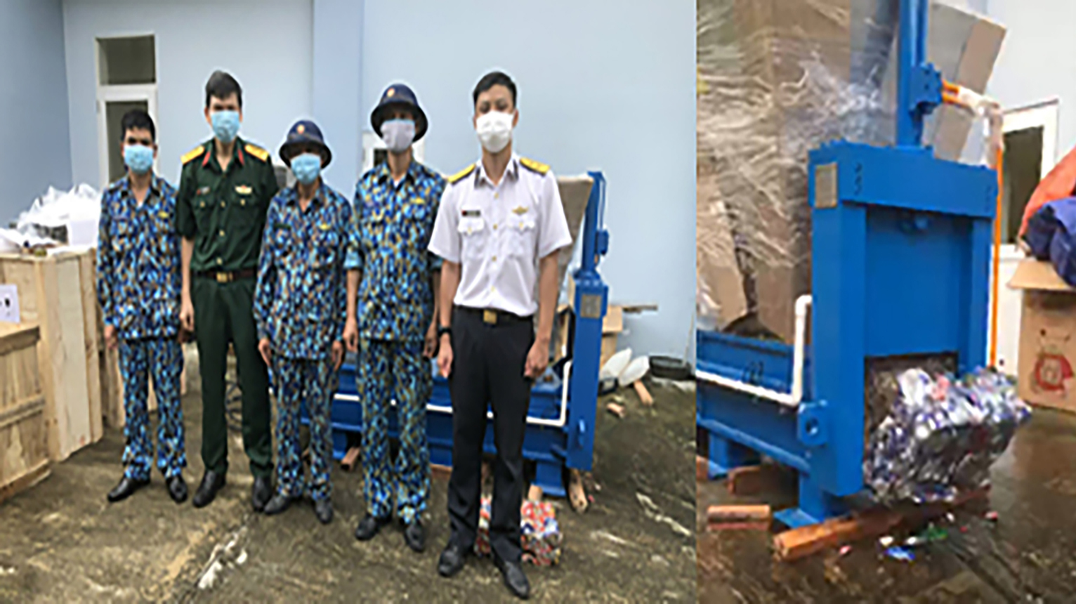 Máy ép vận hành đơn giản, dễ sử dụng tiêu thụ công suất điện … Tuỳ theo lượng rác thải rắn được thu gom, phân loại, đơn vị thực hiện vận hành máy ép đối với vỏ lon, đồ họp bằng kim loại khoảng 3-7 ngày/lần, mỗi lần khoảng 50-60 lượt ép, mỗi lượt ép trong thời gian khoảng 5 phút, cho khối rác dạng hộp chữ nhật, kích thước …cm, khối lượng khoảng 10 kg. Khối rác sau khi ép được bao gói kín bằng túi nilon để gửi theo các tàu đưa về đất liền xử lý, tái chế.