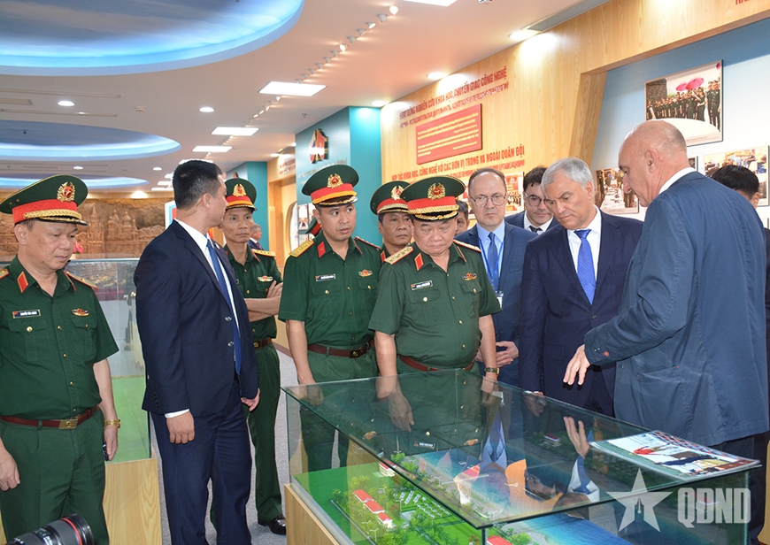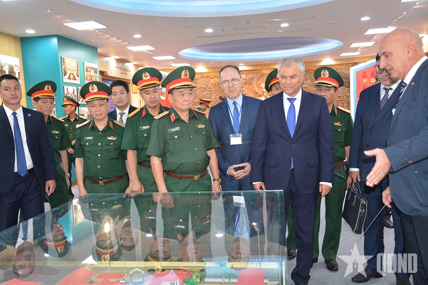 Chủ tịch Duma Quốc gia Quốc hội Liên bang Nga Vyacheslav Volodin và Thượng tướng Hoàng Xuân Chiến cùng đoàn đại biểu hai nước tham quan Nhà truyền thống của Trung tâm Nhiệt đới Việt-Nga.
