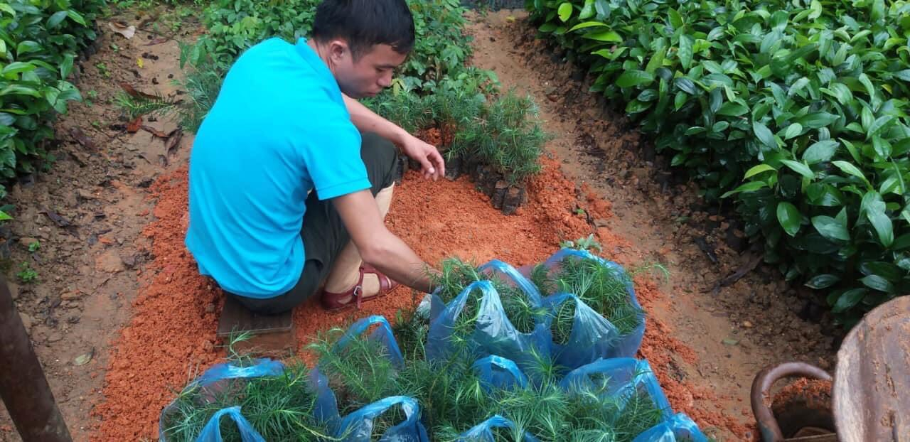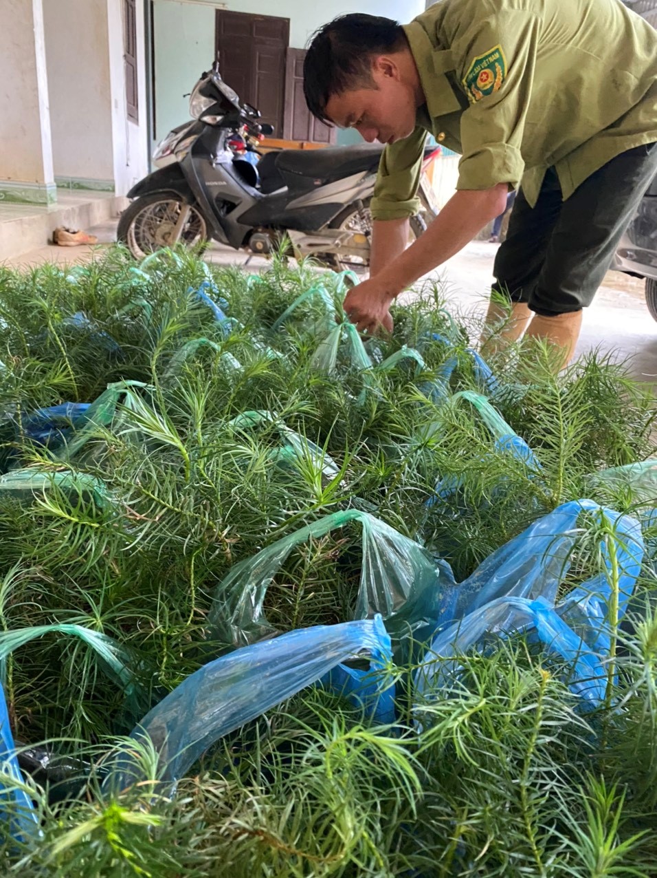 Cán bộ kỹ thuật của BQL KBTTN Pù Hoạt - huyện Quế Phong, tỉnh Nghệ An tiếp nhận 500 cây giống đưa vào tiếp tục nhân nuôi tại Trạm Quản lý bảo vệ rừng Na Chạng - Nghệ An. (Ảnh: Phạm Mai Phương và cộng sự).