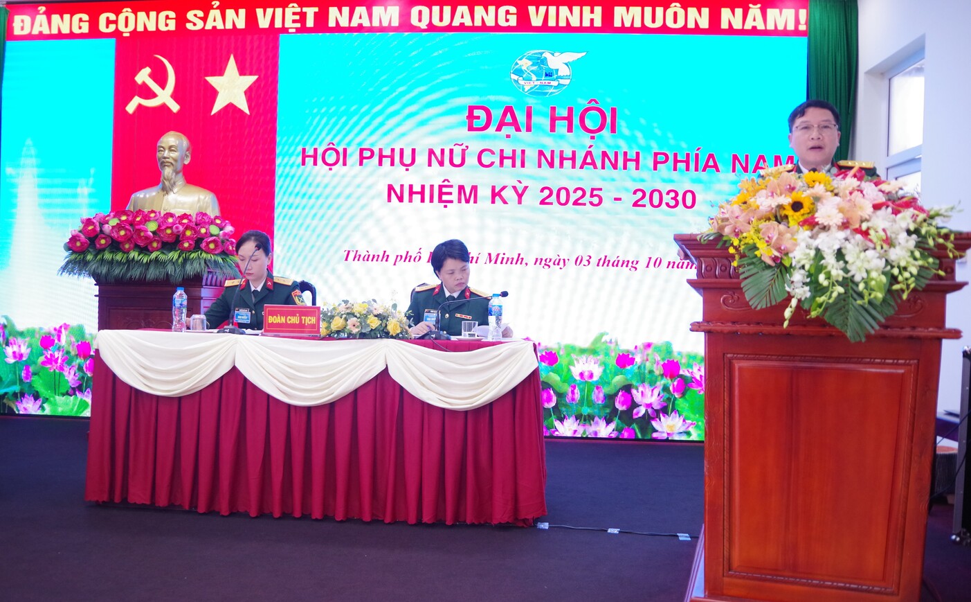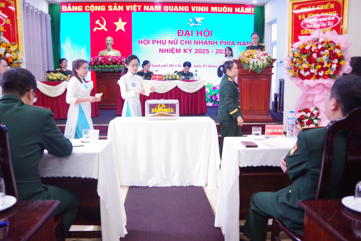 03/10/2025Sáng ngày 03/10, Hội Phụ nữ Chi nhánh Phía Nam (Chi nhánh) tổ chức Đại hội nhiệm kỳ 2025 - 2030. Dự và chỉ đạo Đại hội có đồng chí Thượng tá Hà Văn Toàn, Bí thư Đảng ủy, Chính trị viên; đồng chí Đại tá Nguyễn Văn Thịnh, Phó Bí thư Đảng ủy, Giám đốc Chi nhánh; dự theo dõi Đại hội có các đồng chí lãnh đạo, chỉ huy các cơ quan, đơn vị trực thuộc, Ban chấp hành Chi đoàn thanh niên.