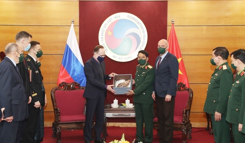 Thiếu tướng Đặng Hồng Triển, Tổng Giám đốc Trung tâm Nhiệt đới Việt - Nga trao quà lưu niệm tặng Đại sứ G.S. Bezdetko.