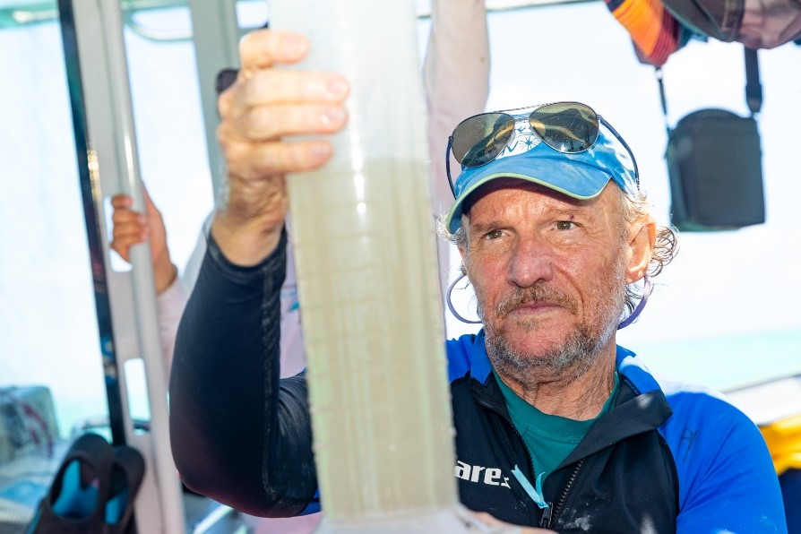 Giáo sư Peter Harrison, nhà tiên phong trong lĩnh vực “thụ tinh nhân tạo” san hô đang kiểm tra mật độ ấu trùng san hô trong một dự án phục hồi san hô ở đảo Heron, Australia. Nguồn: http://time.com.
