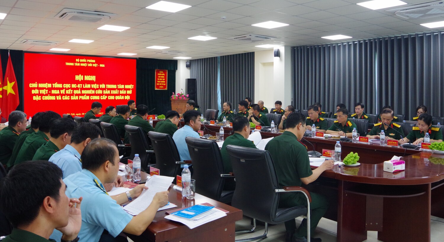 Tại hội nghị, các đại biểu đã nghe TTNĐ Việt - Nga báo cáo kết quả nghiên cứu, sản xuất một số loại dầu mỡ và các sản phẩm cung cấp cho Quân đội; kết quả cung cấp sản phẩm cho Tổng cục HC-KT trong thời gian qua và việc phối hợp với các cơ quan, đơn vị thuộc Tổng cục HC-KT triển khai các nội dung theo chương trình, thoả thuận đã ký kết giữa hai bên. Báo cáo tập trung vào ba nhóm sản phẩm: các sản phẩm đã được đưa vào ứng dụng thực tế; các sản phẩm đã đủ điều kiện để ứng dụng vào thực tế; và các sản phẩm đang có tiềm năng ứng dụng trong thời gian tới.
