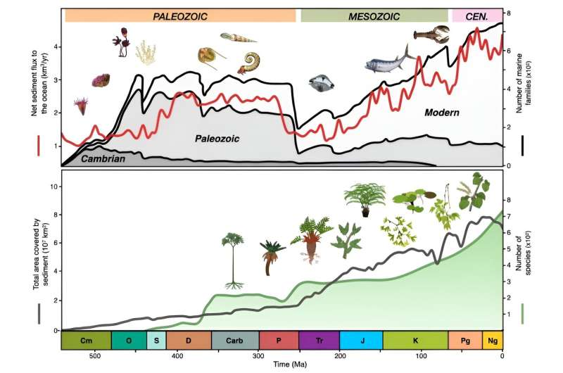 Dòng trầm tích tới các đại dương và sự đa dạng của các họ động vật biển trong 540 triệu năm qua. Hệ số tương quan Pearson 0,88 chỉ ra mối tương quan chặt chẽ giữa hai biến. Nguồn: Nature.