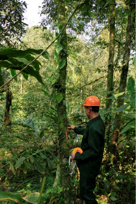 Cán bộ Ban quản lý Rừng phòng hộ huyện Hoàng Su Phì chăm sóc, ghi chép sinh trưởng của Sa mu dầu tại Nam Sơn, Hoàng Su Phì (Nguồn: Phạm Mai Phương, 2025).