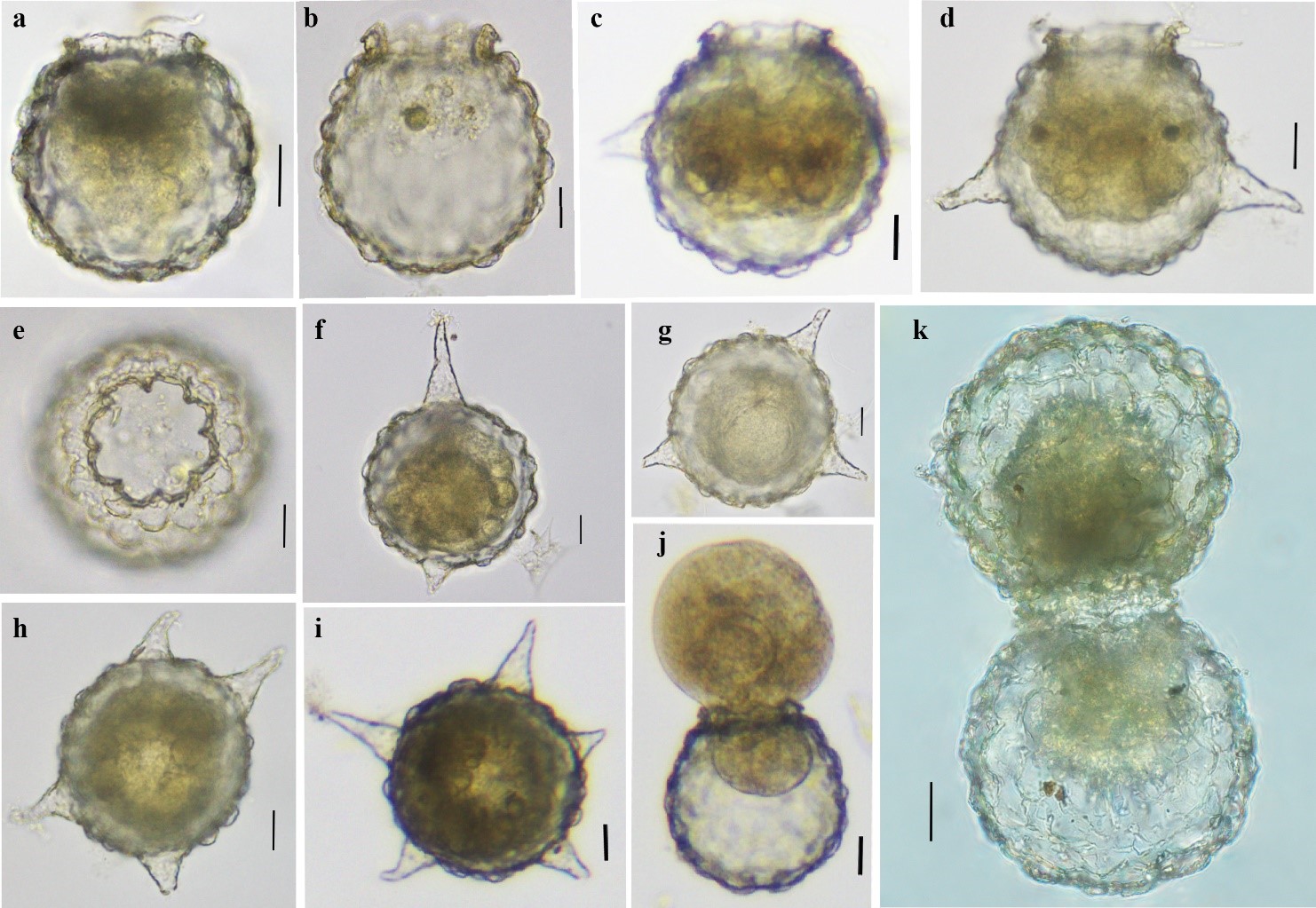 Hình ảnh loài Netzelia tuberspinifera quan sát dưới kính hiển vi quang học. a-d: nhìn từ phía bên; e: nhìn từ miệng; f-i: số lượng gai khác nhau trên vỏ; j: nguyên sinh chất; k: phân bào. Thang đo: 20 µm (Nguồn: Tran et al., 2021).