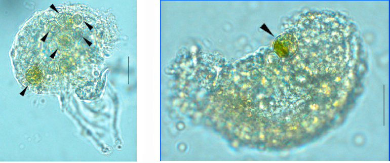 Hình ảnh các tế bào tảo cộng sinh trong nguyên sinh chất của loài Netzelia tuberspinifera (hướng mũi tên chỉ). Thang đo: 20 µm.