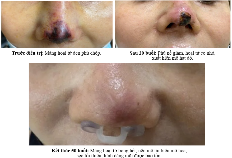 - Kết thúc 50 buổi: Mảng hoại tử bong hết, nền mô tái biểu mô hóa, sẹo tối thiểu, hình dáng mũi được bảo tồn, không cần ghép da.