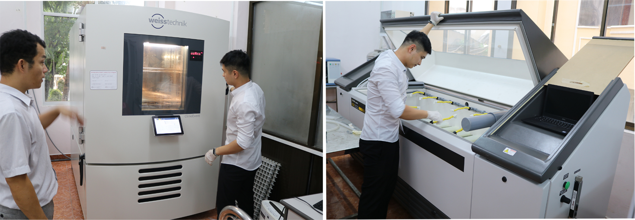 Hệ thống trang thiết bị được đầu tư đồng bộ phục vụ cho hoạt động thử nghiệm như: Hệ thống máy thử rung, sóc của Hãng Bruel & Kjae, thiết bị đo độ bền kéo, nén vật liệu Z010 TH ProLine, tủ thử nghiệm nhiệt ẩm Clime-Event C/1000/40/3, thiết bị thử nghiệm ăn mòn CCX3000, buồng thử Ozone OREC TM Ozone, thiết bị phân tích nhiệt DSC3+, hệ thống thiết bị thử nghiệm IP1 đến IP6 của ED&D, thiết bị thử nghiệm chống bụi ST1000U, Hãng Weisstechnik...
