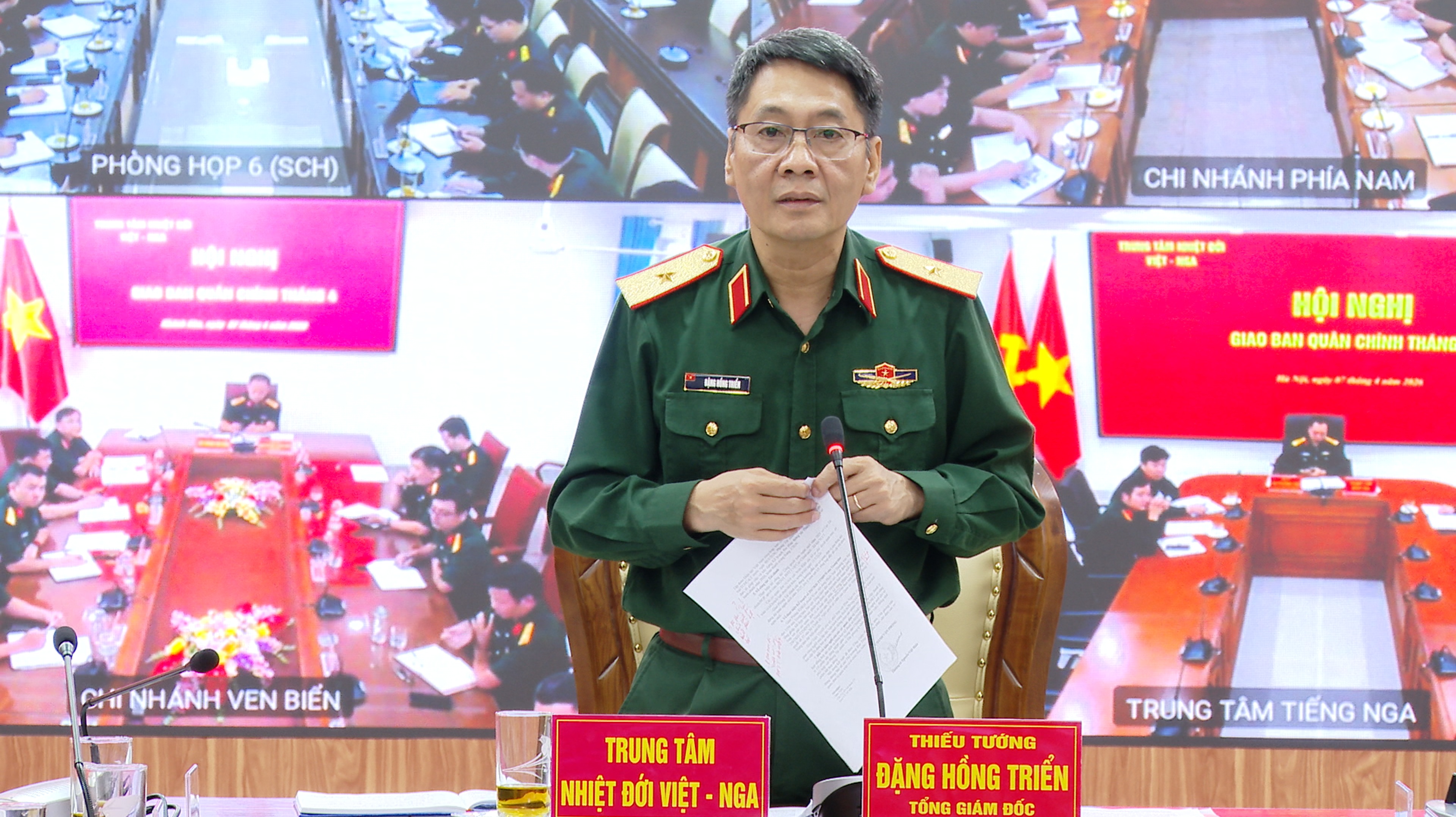 07/04/2026Sáng 07/4, tại Hà Nội, Trung tâm Nhiệt đới Việt - Nga (Trung tâm) tổ chức Hội nghị giao ban Quân chính tháng 4. Thiếu tướng Đặng Hồng Triển, Tổng Giám đốc Trung tâm chủ trì Hội nghị. Hội nghị được tổ chức theo hình thức trực tiếp tại Cơ sở chính kết hợp trực tuyến với các điểm cầu trong Trung tâm. Dự Hội nghị có các đồng chí trong Ban Tổng Giám đốc; lãnh đạo, chỉ huy và cán bộ chủ chốt các cơ quan, đơn vị trực thuộc Trung tâm.