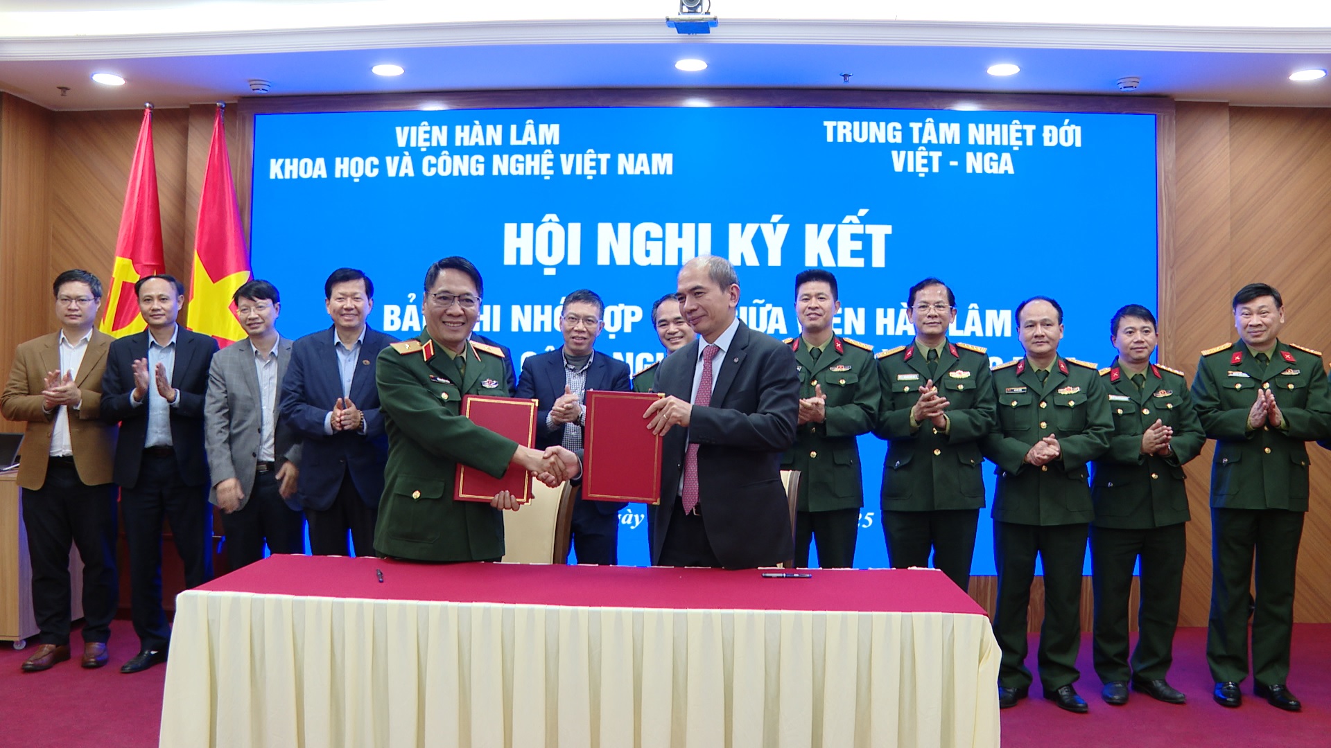 Cũng tại hội nghị, Viện Hàn lâm KH&CN Việt Nam và TTNĐ Việt - Nga đã ký kết Bản ghi nhớ hợp tác trong nghiên cứu khoa học giai đoạn 2025 - 2030. Theo đó, hai bên phối hợp thực hiện các nội dung chính: Tham gia, phối hợp thực hiện các nhiệm vụ KH&CN theo nhu cầu và năng lực thực hiện của hai bên; hợp tác hoàn thiện, triển khai ứng dụng các sản phẩm KH&CN của hai bên vào thực tiễn phục vụ nhiệm vụ quân sự, quốc phòng và phát triển kinh tế - xã hội, bảo tồn đa dạng sinh học, bảo vệ các hệ sinh thái, môi trường; hai bên hỗ trợ việc sử dụng các trang thiết bị phục vụ nghiên cứu, phân tích, trạm quan trắc khí hậu, thời tiết, trạm thử nghiệm tự nhiên, nhà xưởng, máy móc phục vụ sản xuất chế thử và sản xuất sản phẩm nghiên cứu; Viện Hàn lâm KH&CN Việt Nam hỗ trợ đào tạo, bồi dưỡng nguồn nhân lực KH&CN chất lượng cao cho TTNĐ Việt - Nga; phối hợp và hỗ trợ TTNĐ Việt - Nga trong lĩnh vực in ấn, xuất bản ấn phẩm KH&CN; TTNĐ Việt - Nga phối hợp, hỗ trợ Viện Hàn lâm KH&CN Việt Nam triển khai ứng dụng thực tế kết quả KH&CN trong lĩnh vực quân sự, quốc phòng; hỗ trợ Viện Hàn lâm KH&CN Việt Nam tham gia chủ trì, phối hợp thực hiện các chương trình KH&CN do TTNĐ Việt - Nga chủ trì thực hiện; hợp tác trong công bố quốc tế, đăng ký quyền sở hữu trí tuệ; tổ chức hội nghị, hội thảo khoa học trong nước, quốc tế và cử chuyên gia tham gia các hội đồng KH&CN.