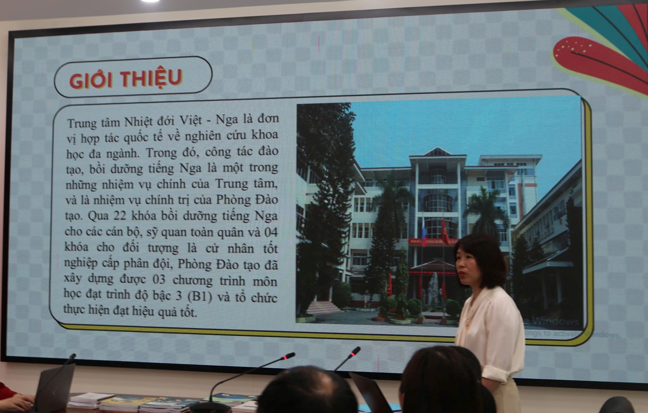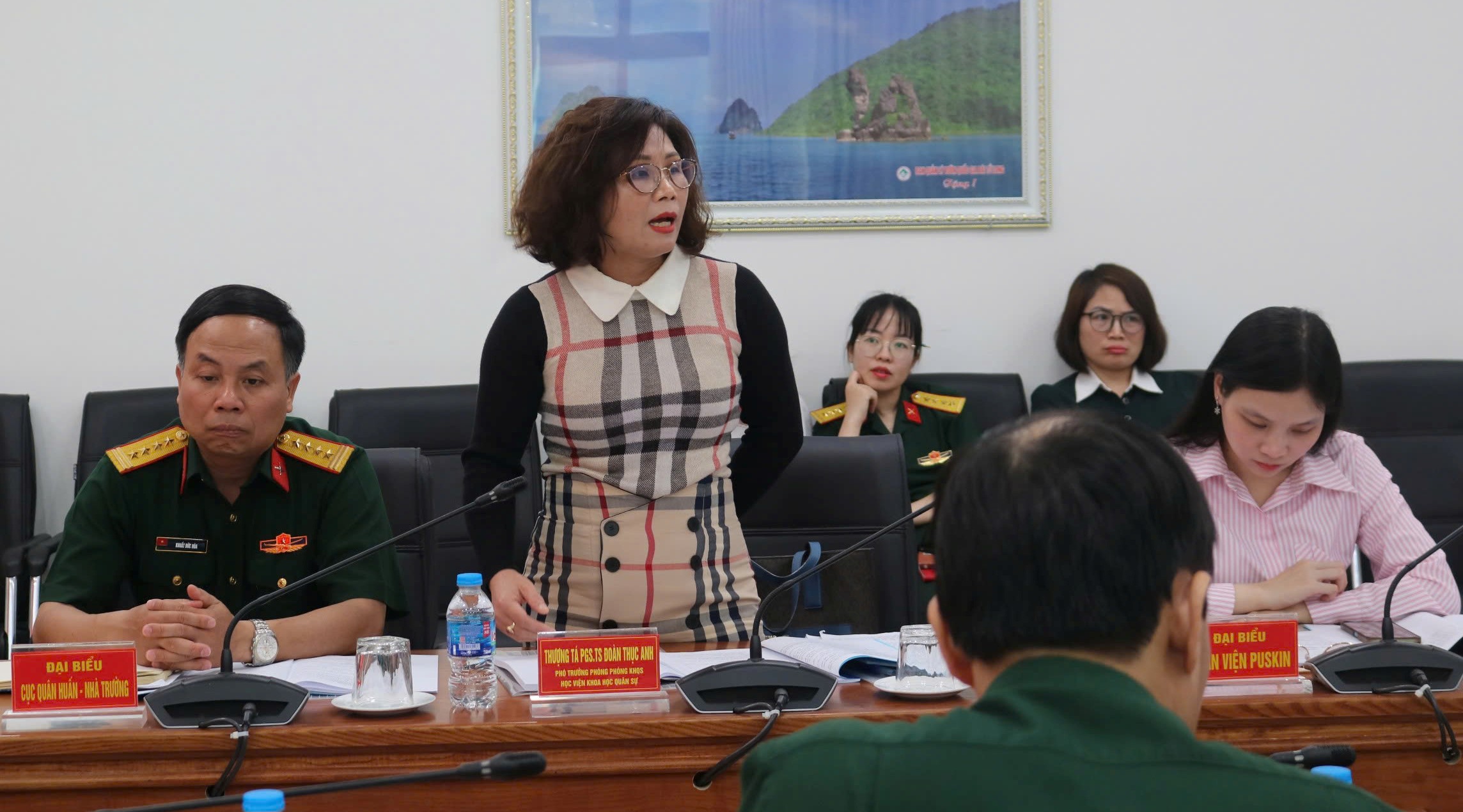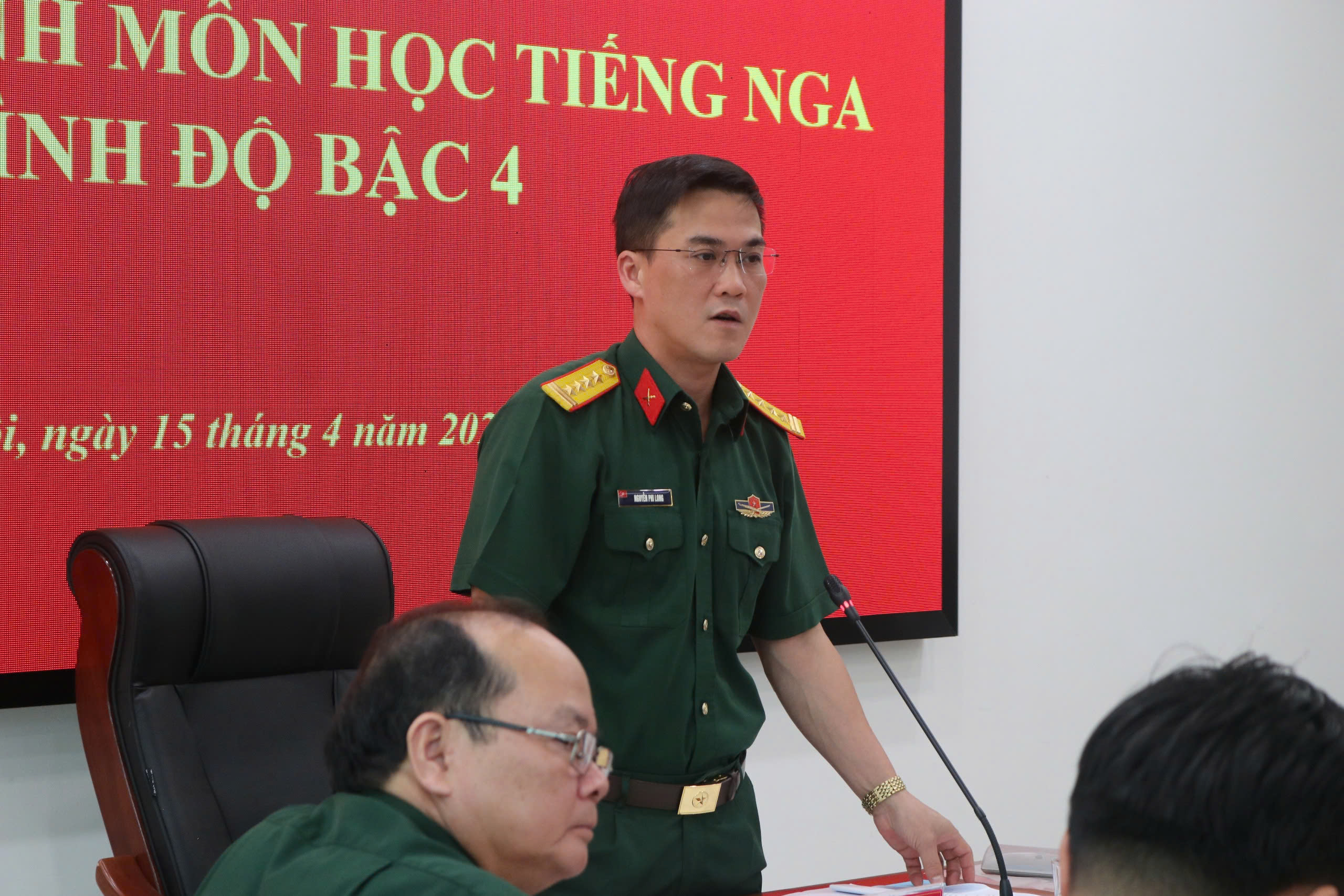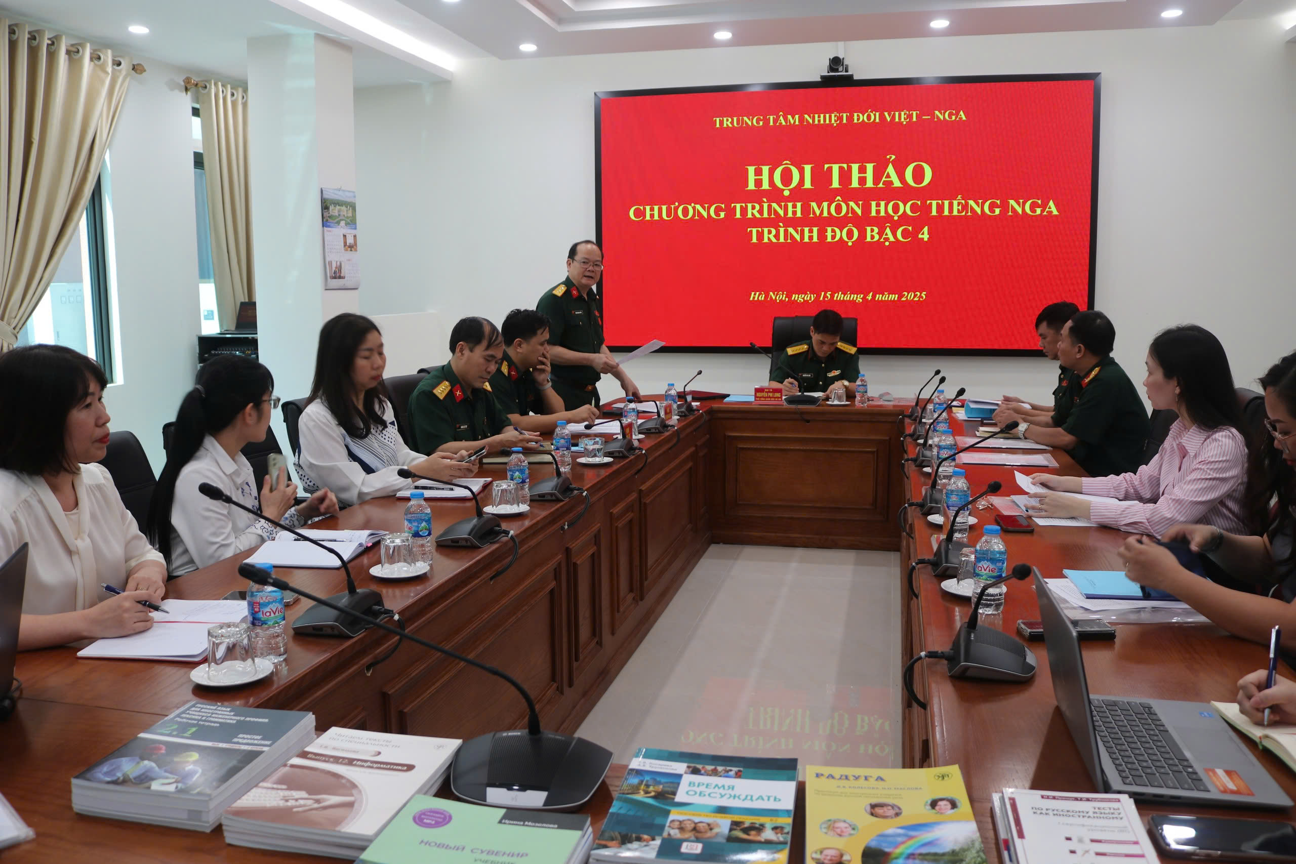 Đại tá, TS. Nguyễn Phi Long, Phó Tổng Giám đốc Trung tâm chủ trì hội thảo. Cùng tham dự có Thượng tá, PGS. TS. Đoàn Thục Anh, Phó Trưởng phòng Khoa học quân sự/Học viện Khoa học quân sự; TS. Phạm Dương Hồng Ngọc, Phó Chủ nhiệm Khoa Ngôn ngữ và Văn hoá Nga/Đại học Ngoại ngữ/Đại học Quốc gia Hà Nội; đại biểu Cục Cán bộ/Tổng cục Chính trị, Cục Quân huấn - Nhà trường/Bộ Tổng Tham mưu, Phân viện Puskin tại Hà Nội; Thủ trưởng, giáo viên Phòng Đào tạo và tổ biên soạn chương trình.