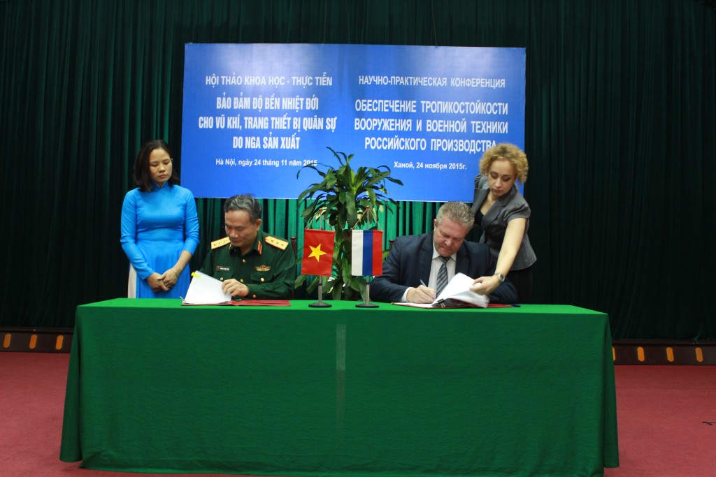 26/11/2015Ngày 24-11, tại Hà Nội, Trung tâm Nhiệt đới Việt – Nga đã phối hợp với Tổng cục Kỹ thuật, Quân chủng Phòng không- Không quân và Quân chủng Hải quân tổ chức Hội thảo khoa học, thực tiễn giữa Việt Nam và LB Nga với chủ đề “Bảo đảm độ bền nhiệt đới cho vũ khí, trang thiết bị quân sự do LB Nga sản xuất”. Thượng tướng Trương Quang Khánh, Ủy viên Trung ương Đảng, Thứ trưởng Bộ Quốc phòng, Chủ tịch Phân ban Việt Nam Ủy ban liên Chính phủ về Hợp tác kỹ thuật quân sự Việt – Nga, Chủ tịch Phân ban Việt Nam Ủy ban phối hợp về Trung tâm Nhiệt đới Việt – Nga và ông Đrô-dốp Vla-đi-mia Ni-cô-la-ê-vích (Drozhzhov Vladimir Nikolayevich), Phó giám đốc Cơ quan Liên bang về Hợp tác kỹ thuật quân sự Nga, đồng chủ trì hội thảo.