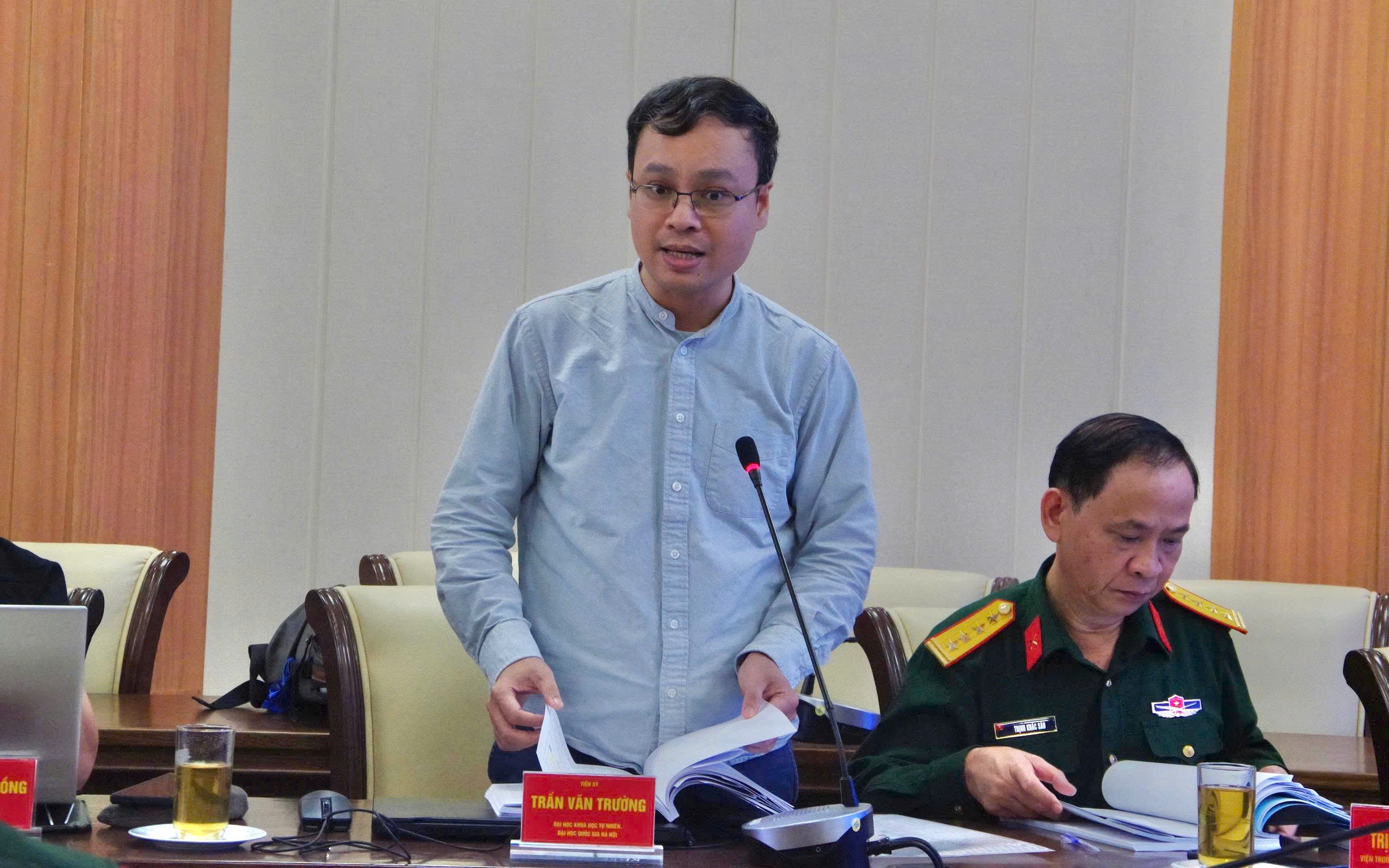 Đại tá, TS. Phạm Duy Nam, Phó Tổng Giám đốc Trung tâm chủ trì Hội thảo. Tham dự Hội thảo có các chuyên gia trong lĩnh vực xây dựng bản đồ; đại diện lãnh đạo, chỉ huy cơ quan quản lý khoa học, các viện nghiên cứu và cán bộ khoa học quan tâm.