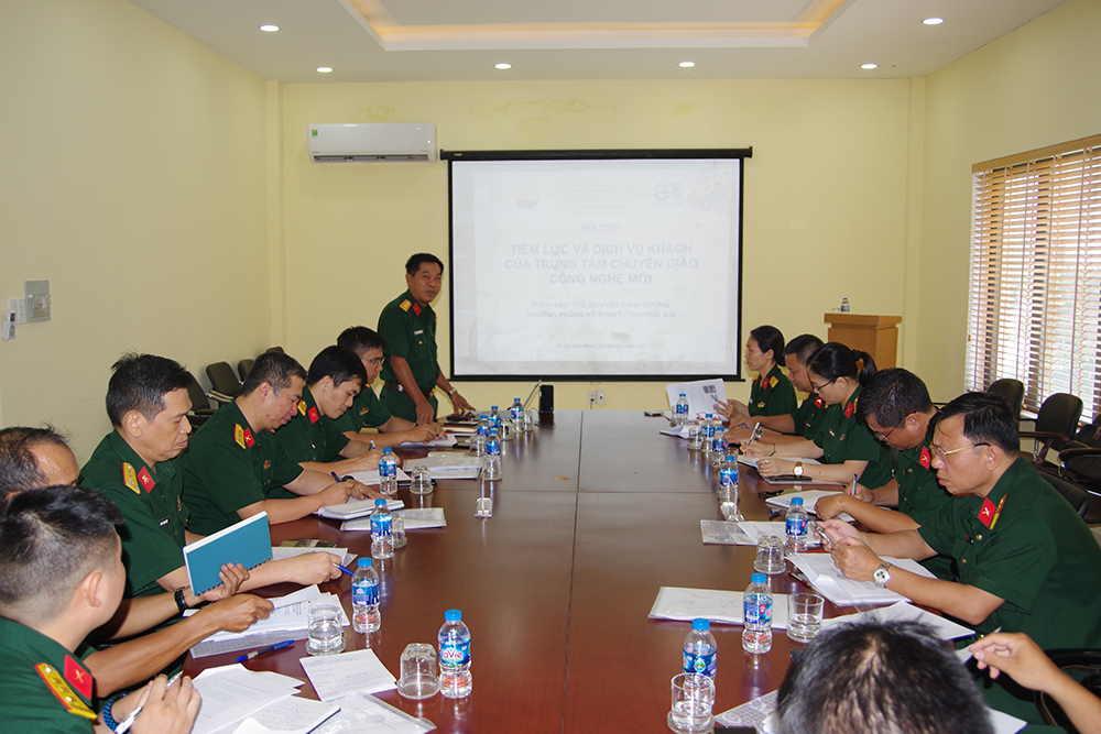 Đồng chí Đại tá Bùi Huy Trà, Giám đốc Trung tâm Chuyển giao công nghệ mới chủ trì Hội thảo. Tham dự Hội thảo có đồng chí Đại tá, Tiến sĩ Nguyễn Văn Thịnh, Giám đốc Chi nhánh Phía Nam; Thượng tá, Thạc sĩ Phan Thanh Xuân, Phó Giám đốc Trung tâm Chuyển giao công nghệ mới; các đồng chí đại diện cho các cơ quan, đơn vị và cán bộ khoa học thuộc Trung tâm Chuyển giao công nghệ mới và Chi nhánh Phía Nam.