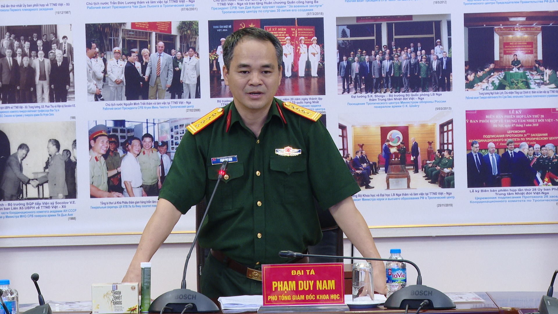 Đồng chí Đại tá, TS. Phạm Duy Nam, Phó Tổng Giám đốc TTNĐ Việt - Nga chủ trì Hội thảo. Tham dự Hội thảo có đại biểu Cục Quân y, Học viện Quân y, Phòng Kế hoạch khoa học, đại diện Thủ trưởng và cán bộ khoa học Viện Y sinh Nhiệt đới.