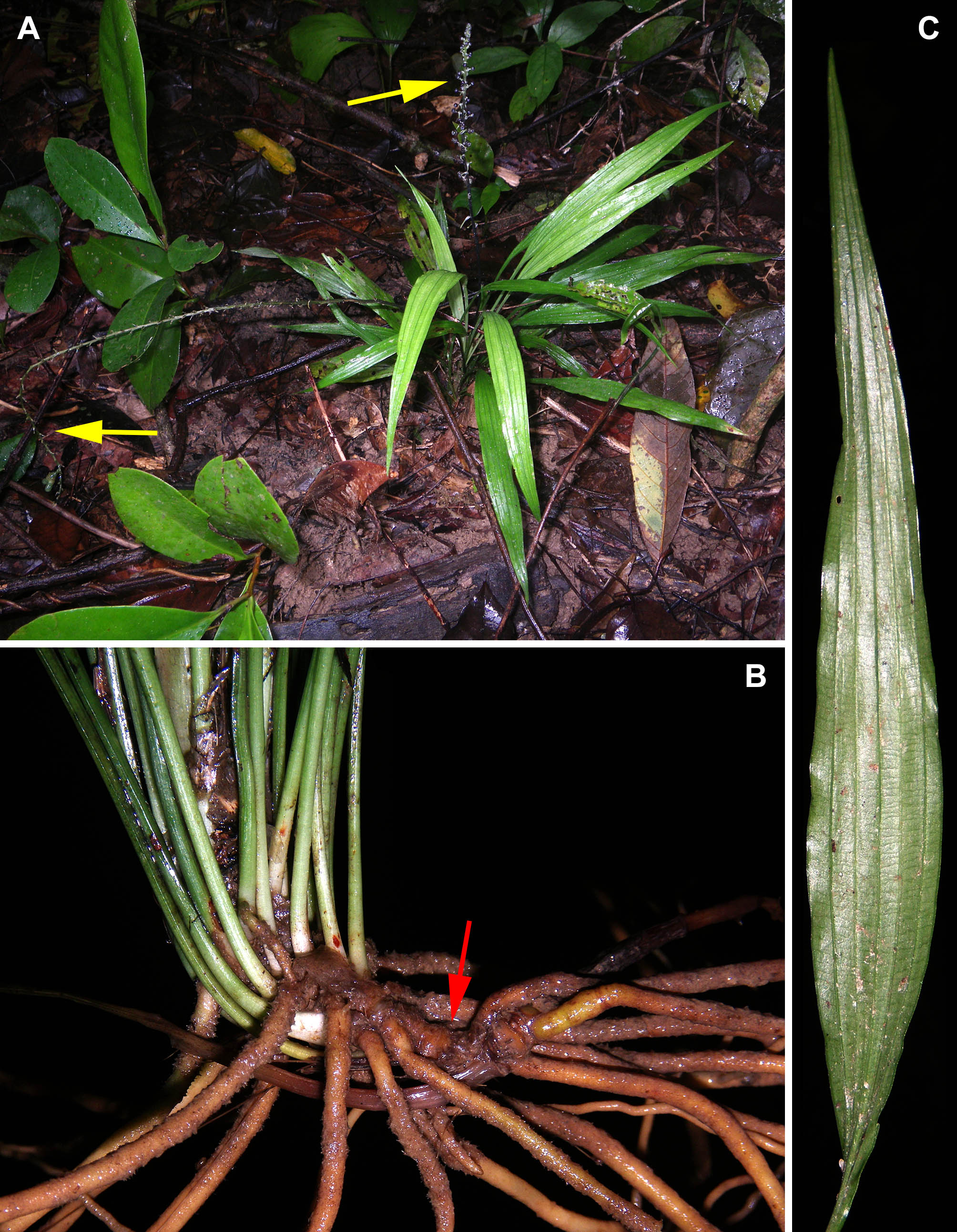 A: Cây trong rừng tự nhiên mang cụm hoa; B: Thân rễ (mũi tên đỏ).