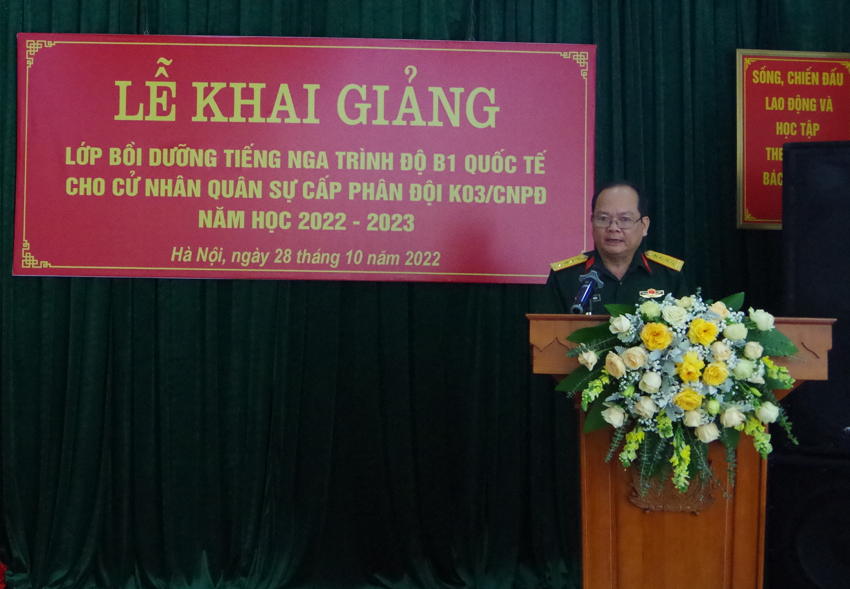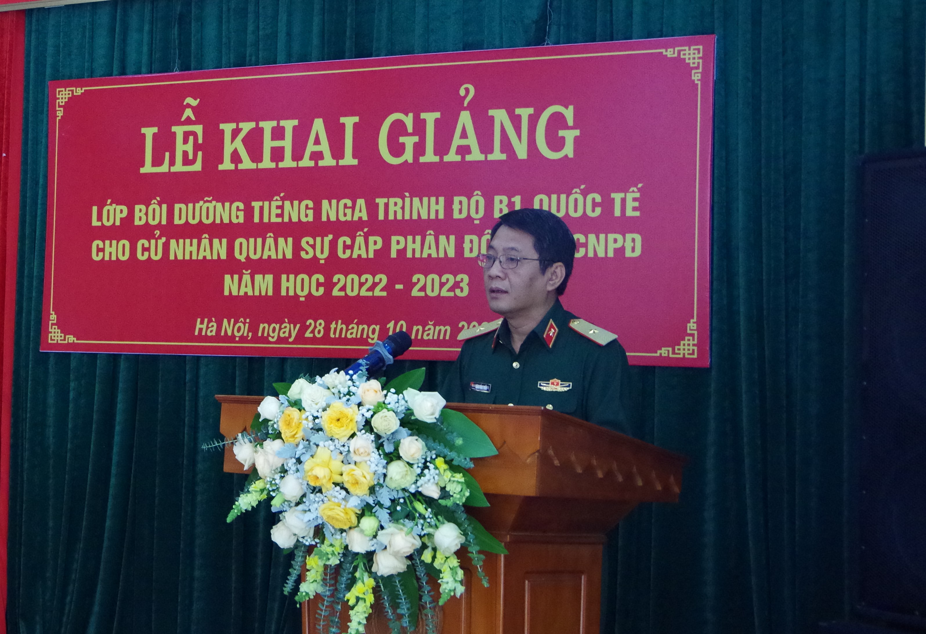 28/10/2022Sáng ngày 28/10, tại Hà Nội, Trung tâm Nhiệt đới Việt - Nga tổ chức Lễ Khai giảng Lớp bồi dưỡng tiếng Nga trình độ bậc 3 (B1) khung Châu Âu cho cử nhân quân sự cấp phân đội khóa 3 (K03/CNPĐ), năm học 2022 - 2023 của Bộ Quốc phòng. Thiếu tướng TS. Đặng Hồng Triển - Tổng Giám đốc Trung tâm chủ trì buổi lễ. Tham dự buổi lễ có các đồng chí đại biểu đại diện lãnh đạo, chỉ huy một số cơ quan, đơn vị thuộc Trung tâm cùng toàn thể giáo viên và học viên khoá K03/CNPĐ.