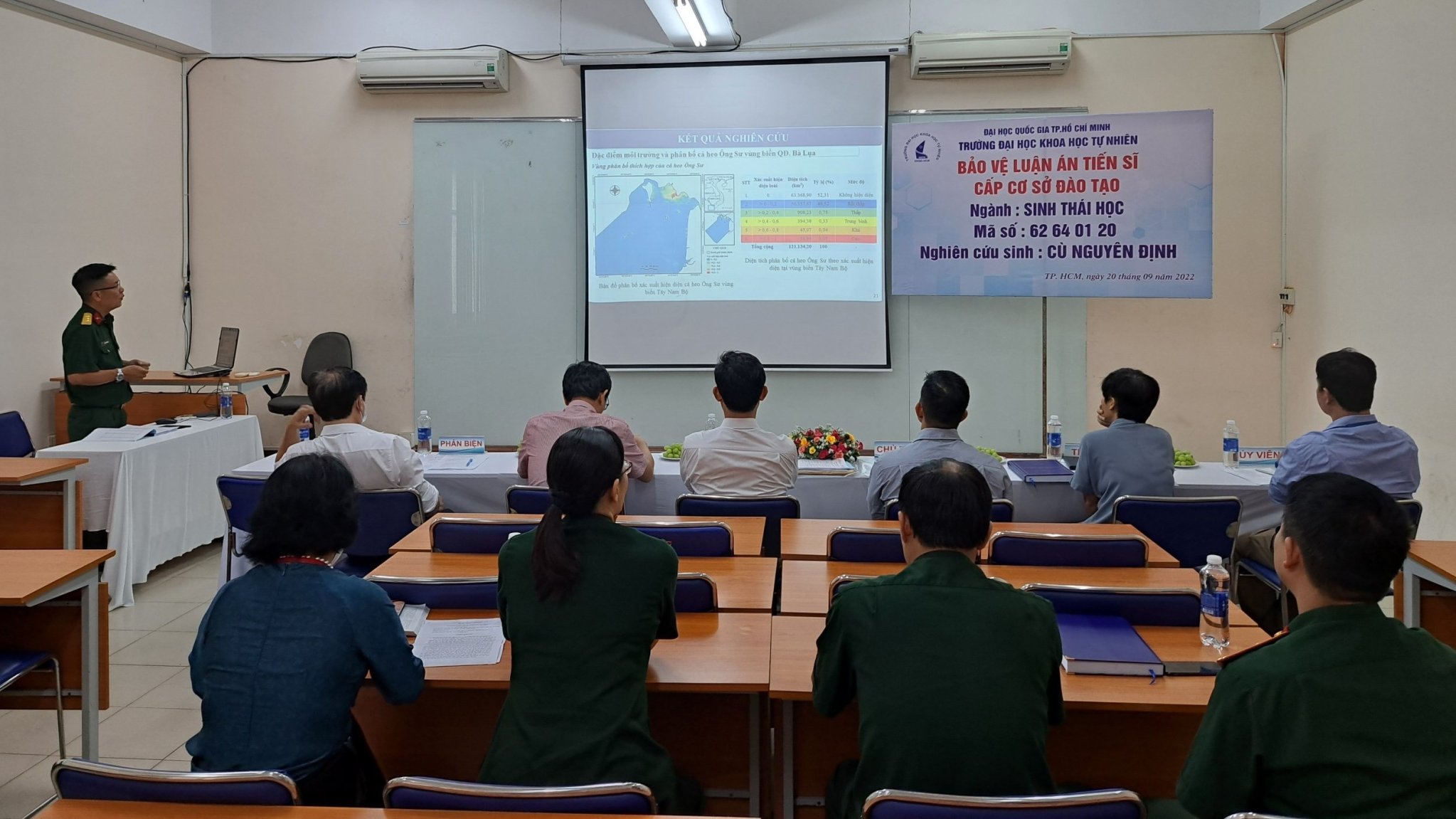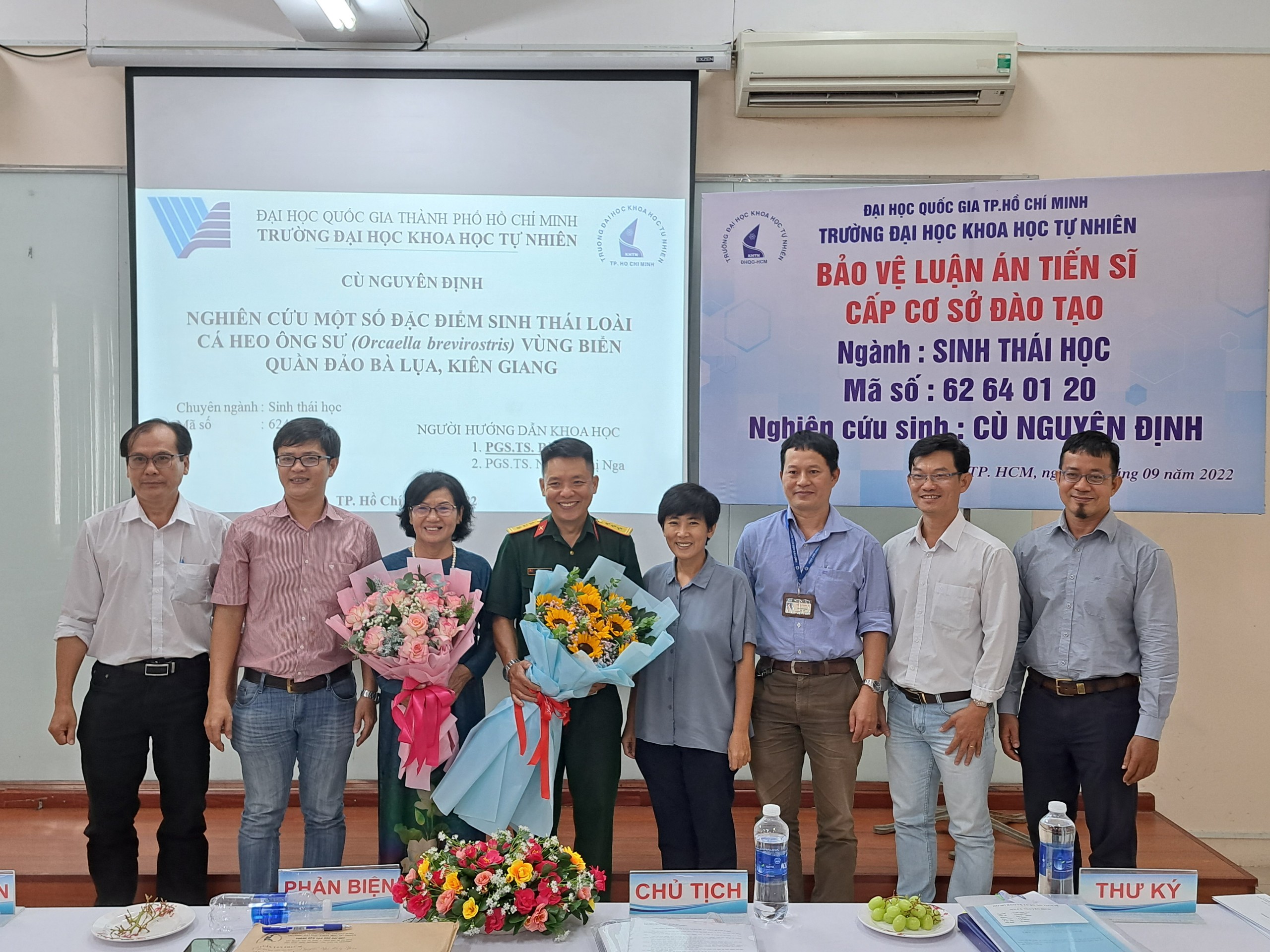 22/09/2022Sáng ngày 20/9/2022, tại Trường Đại học Khoa học Tự nhiên/Đại học Quốc gia Thành phố Hồ Chí Minh đã diễn ra buổi bảo vệ luận án tiến sĩ cấp Trường, ngành Sinh thái học của Nghiên cứu sinh (NCS) Cù Nguyên Định - Trưởng phòng Sinh thái nước, Chi nhánh Phía Nam - Trung tâm Nhiệt đới Việt - Nga, với đề tài: “Nghiên cứu một số đặc điểm sinh thái loài cá heo Ông Sư (Orcaella brevirostris) vùng biển quần đảo Bà Lụa, Kiên Giang” dưới sự hướng dẫn khoa học của Phó Giáo sư, Tiến sĩ Bùi Lai và Phó Giáo sư, Tiến sĩ Nguyễn Thị Nga.