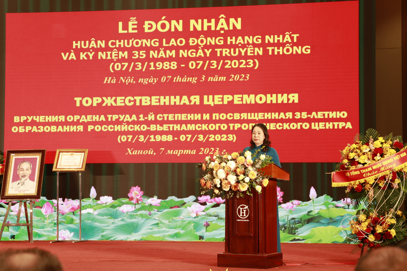 Phát biểu tại buổi Lễ, Phó Chủ tịch nước Võ Thị Ánh Xuân biểu dương, khen ngợi sự nỗ lực phấn đấu, những kết quả, thành tích xuất sắc mà Trung tâm đã đạt được trong suốt chặng đường 35 năm qua. Phó Chủ tịch nước trân trọng cảm ơn Nhà nước, nhân dân, các bộ, ngành của Liên bang Nga, đặc biệt là Bộ Khoa học và Đại học, Viện Hàn lâm khoa học và Đại sứ quán Nga tại Việt Nam đã tích cực phối hợp, hỗ trợ, tạo điều kiện thuận lợi để TTNĐ Việt - Nga hoàn thành xuất sắc nhiệm vụ mà hai Nhà nước Việt Nam và LB Nga giao phó.