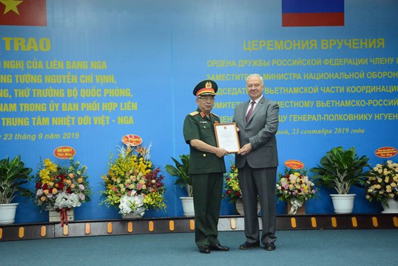 26/09/2019Chiều 23-9, tại Hà Nội đã diễn ra Lễ trao Huân chương Hữu nghị của Liên bang (LB) Nga tặng Thượng tướng Nguyễn Chí Vịnh, Ủy viên Trung ương Đảng, Ủy viên Thường vụ Quân ủy Trung ương, Thứ trưởng Bộ Quốc phòng, Chủ tịch Phân ban Việt Nam trong Ủy ban Phối hợp liên Chính phủ về Trung tâm Nhiệt đới Việt-Nga.