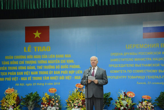 Cảm ơn Nhà nước, Chính phủ LB Nga đã trao tặng Huân chương Hữu nghị, Thượng tướng Nguyễn Chí Vịnh khẳng định đây là sự quan tâm đặc biệt của Nhà nước LB Nga dành cho cá nhân và Bộ Quốc phòng Việt Nam. Theo Thứ trưởng Nguyễn Chí Vịnh, hơn 30 năm xây dựng, phấn đấu và trưởng thành, Trung tâm Nhiệt đới Việt-Nga là mô hình hợp tác khoa học công nghệ quân sự hiệu quả và có vị trí đặc biệt trong mối quan hệ Việt Nam-LB Nga. Trong đó, trung tâm đã hoàn thành hàng trăm đề tài nghiên cứu khoa học quân sự có giá trị thực tiễn cao về sự đa dạng sinh học của hệ sinh thái vùng nhiệt đới, phát triển các công nghệ vật liệu mới chống được sự tác động của môi trường nhiệt đới, các biện pháp y sinh phòng, chống các bệnh nhiệt đới nguy hiểm…