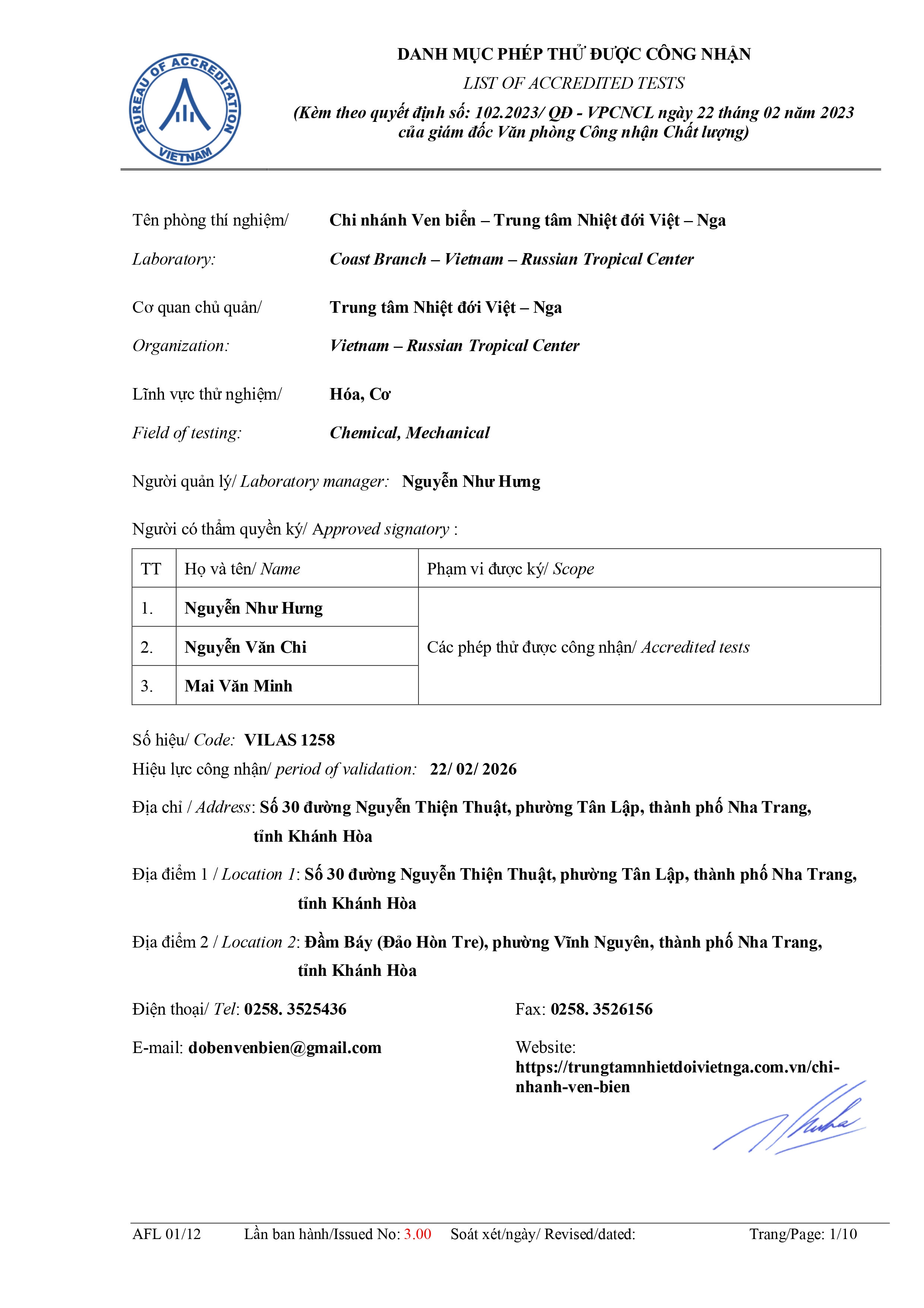 Hàng loạt các hoạt động được CNVB triển khai cụ thể như trước khi được công nhận lần đầu nhưng ở phạm vi và quy mô cao hơn hẳn. Một mặt, việc đào tạo, huấn luyện được tiến hành, mặc khác việc rà soát những điểm không phù hợp trong hồ sơ hệ thống, bộ SOP, Sổ tay chất lượng, các cam kết... trong 3 năm triển khai thực hiện cũng là yếu tố không hề nhỏ. Tuy vậy, với quyết tâm và nỗ lực hoàn thành nhiệm vụ, trong hai ngày 29-30/11/2022, tập thể Phòng thí nghiệm đã phối hợp cùng với Đoàn chuyên gia đánh giá của BoA tiến hành đánh giá toàn diện các tiêu chí của Phòng thí nghiệm CNVB theo 44 chỉ tiêu thử nghiệm (cả đánh giá lại và mở rộng). Đến ngày 22/02/2023 Giám đốc BoA đã ban hành quyết định số 102.2023/QĐ-VPCNCL công nhận PTN Chi nhánh Ven biển (VILAS 1258) đã được đánh giá và phù hợp với yêu cầu của ISO/IEC 17025:2017./.