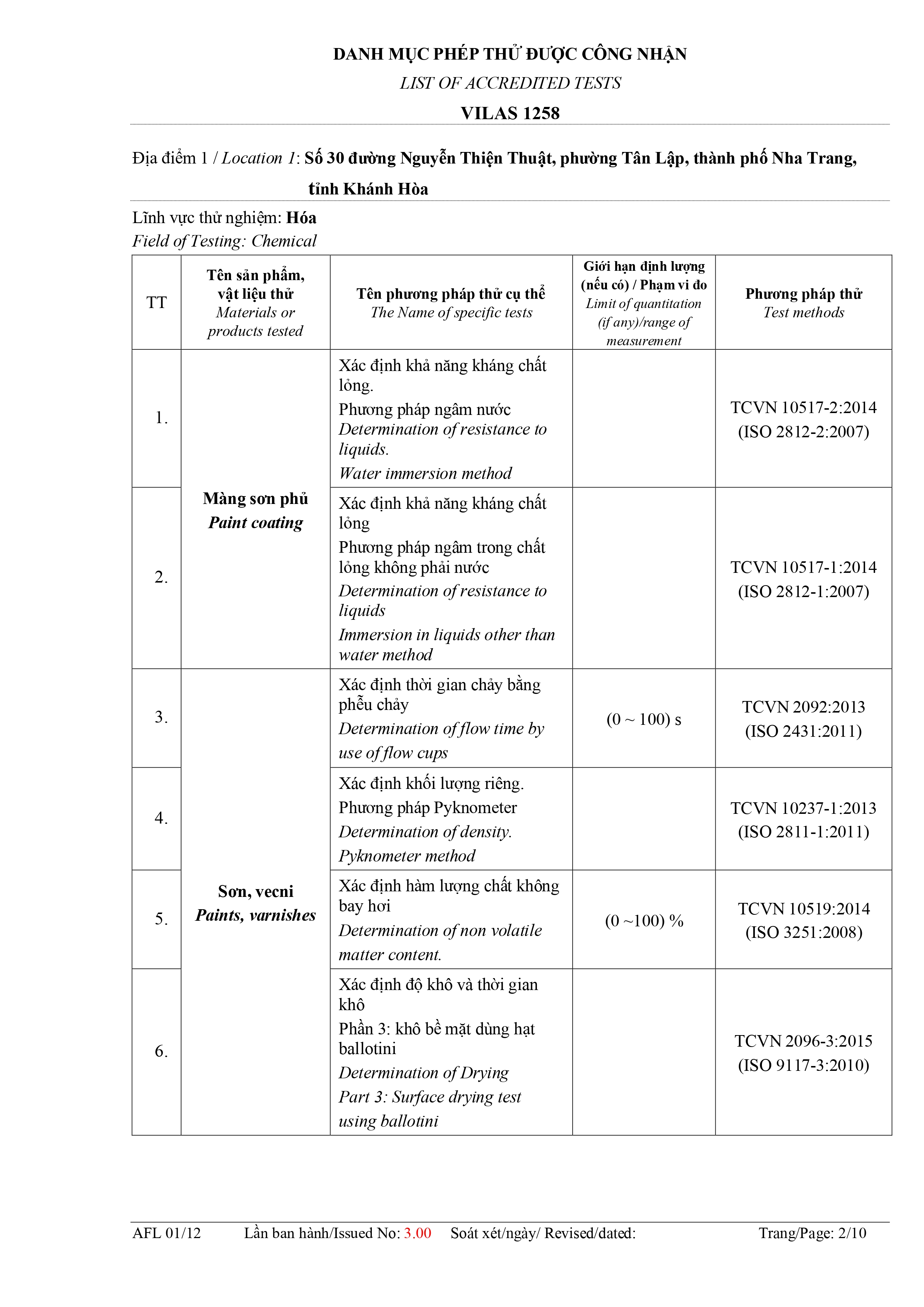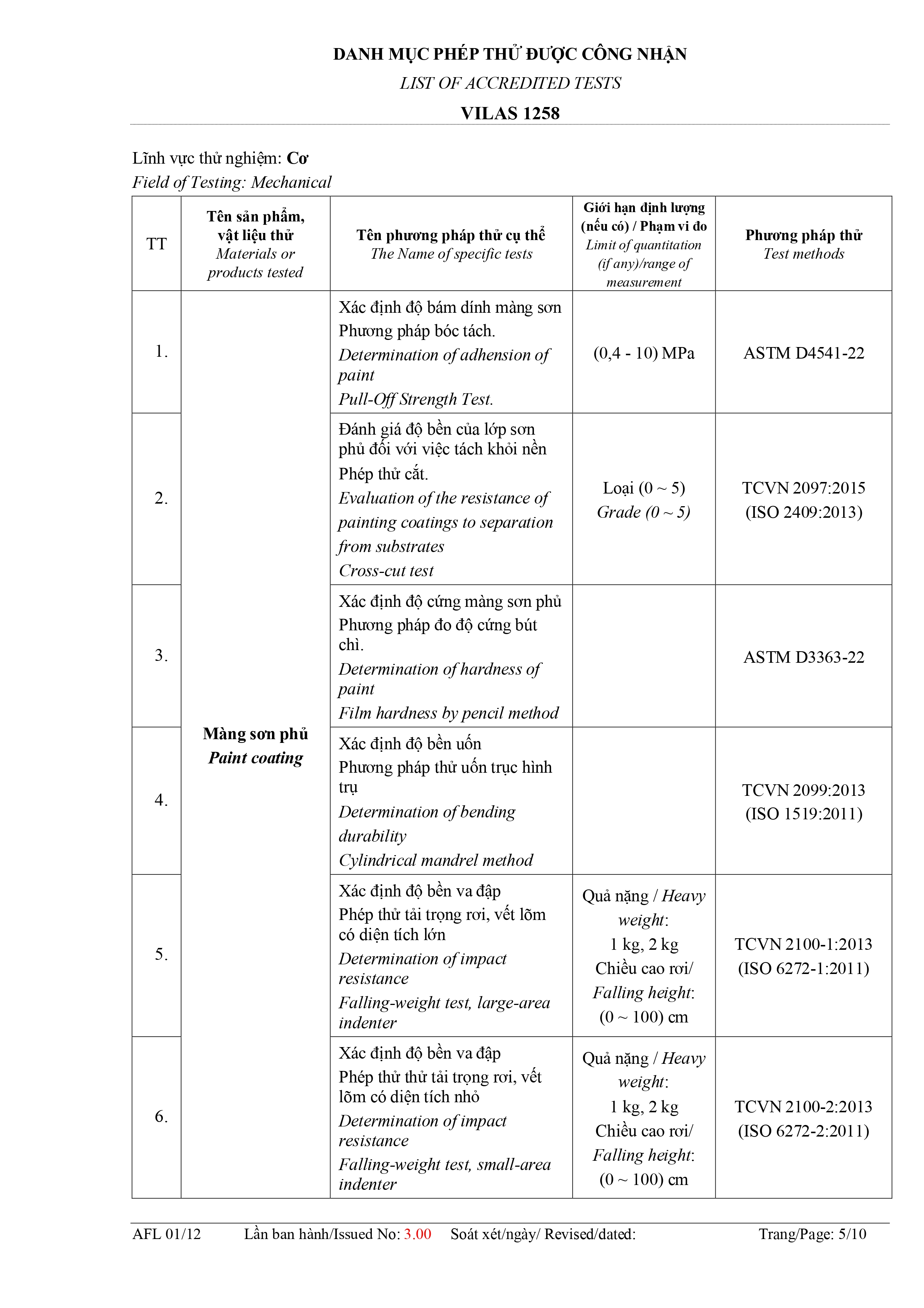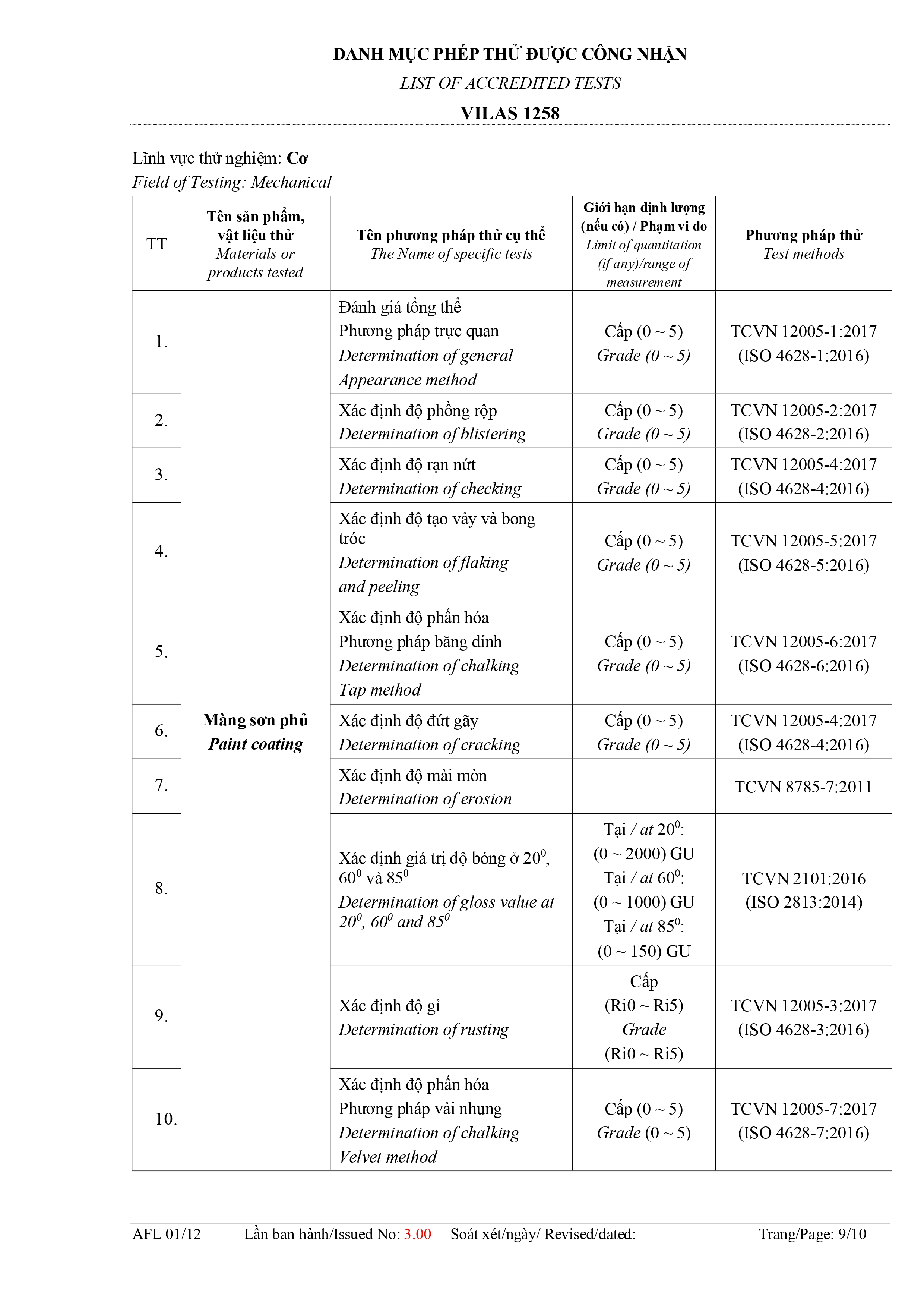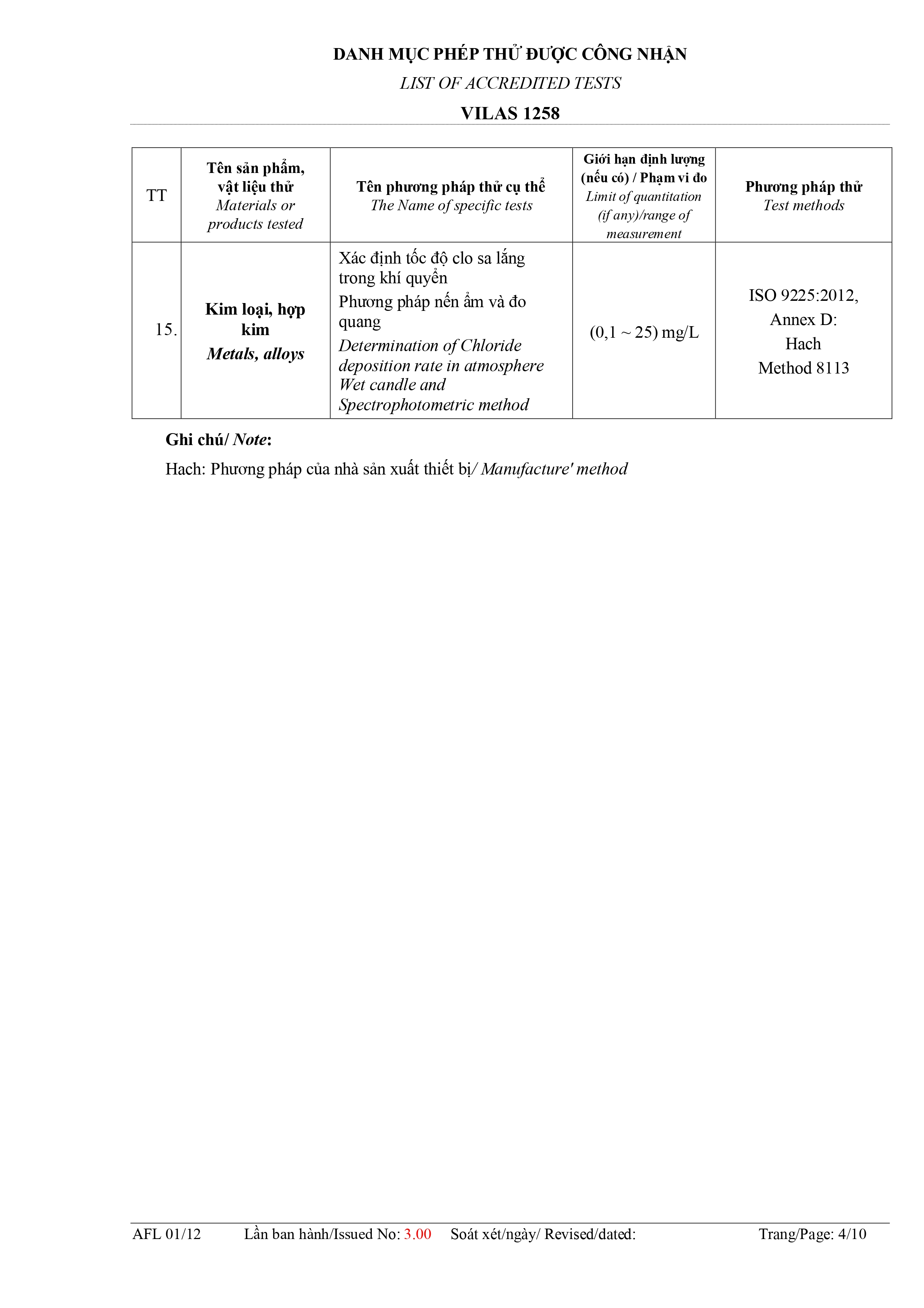 Danh mục phép thử được công nhận: