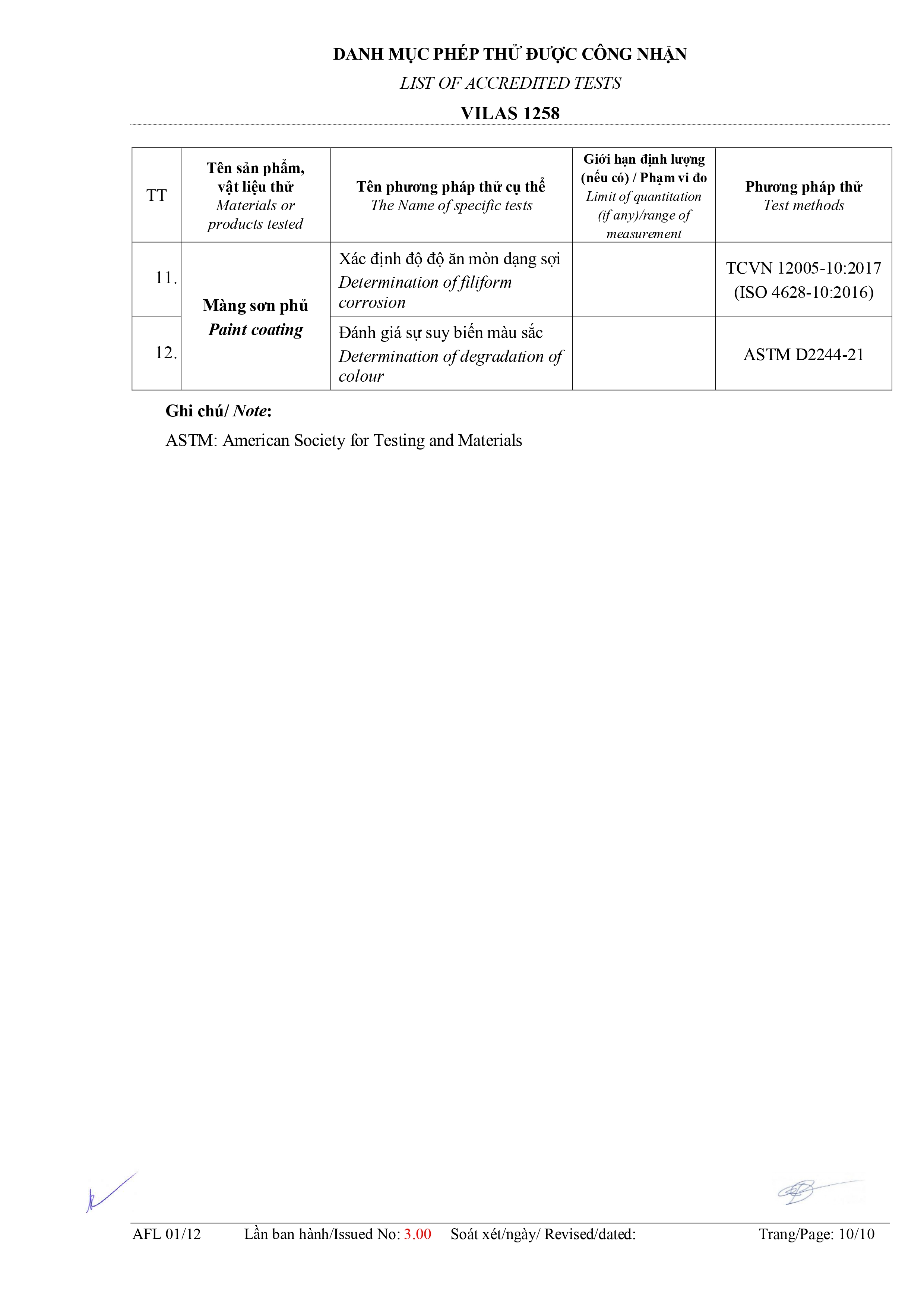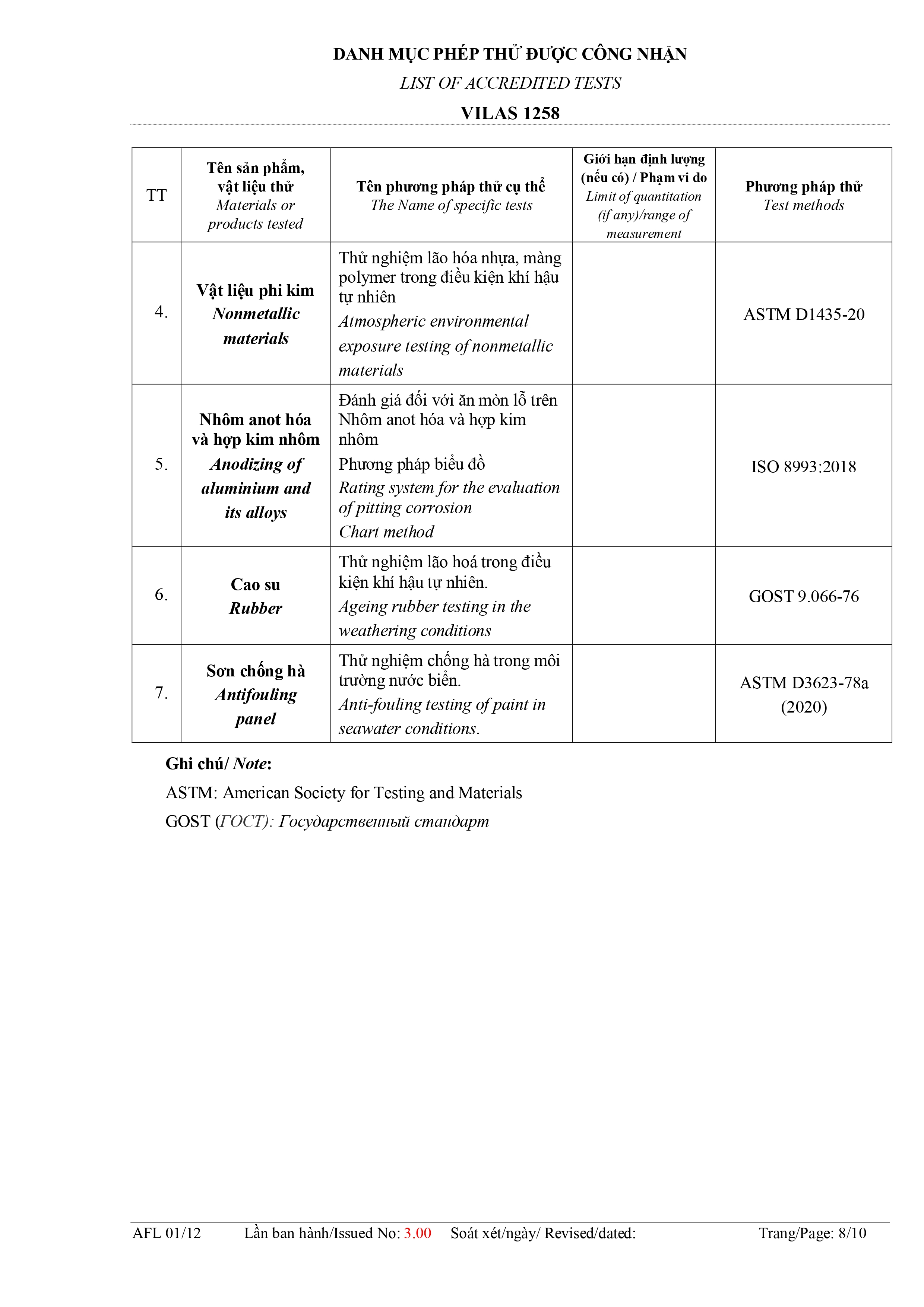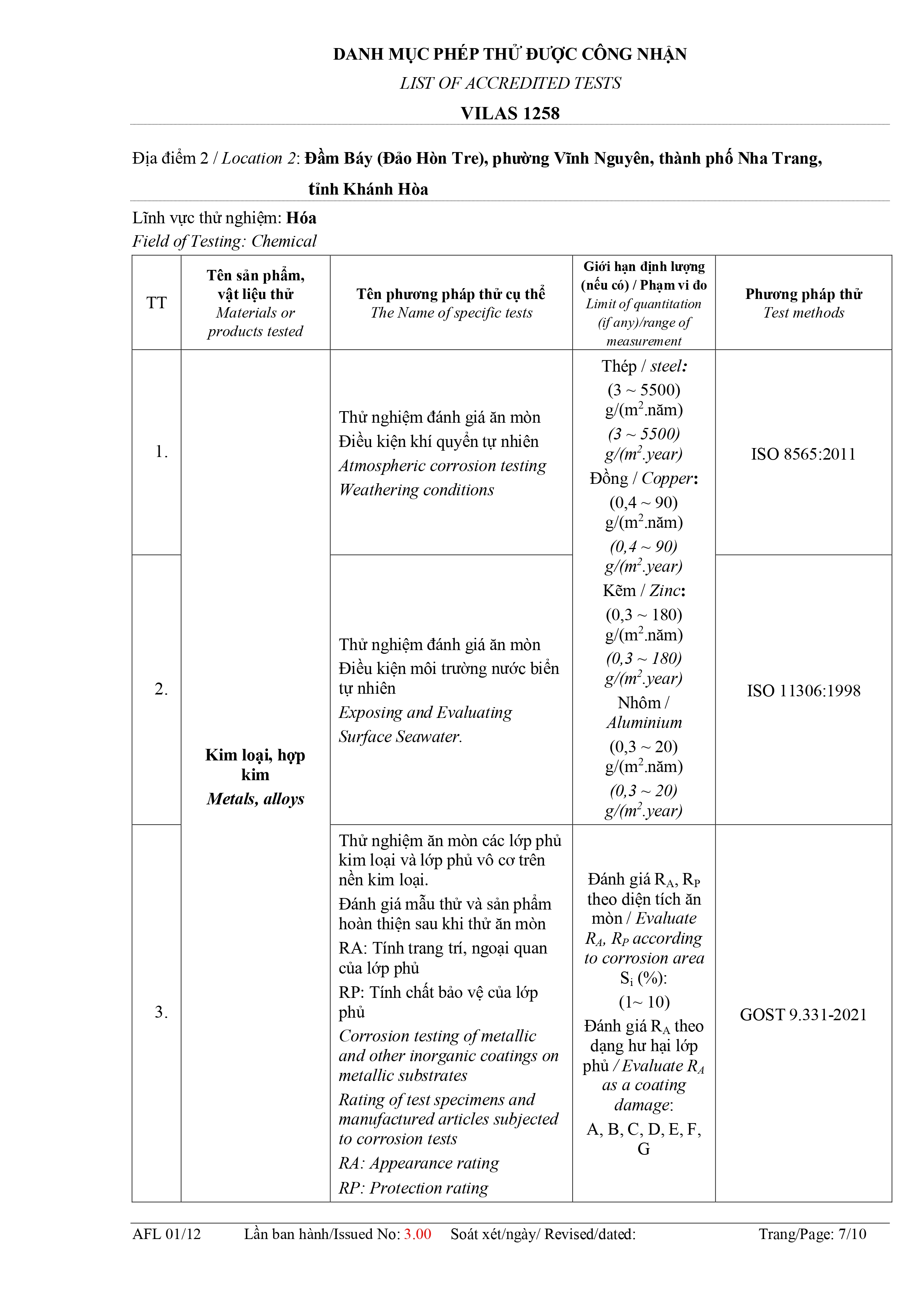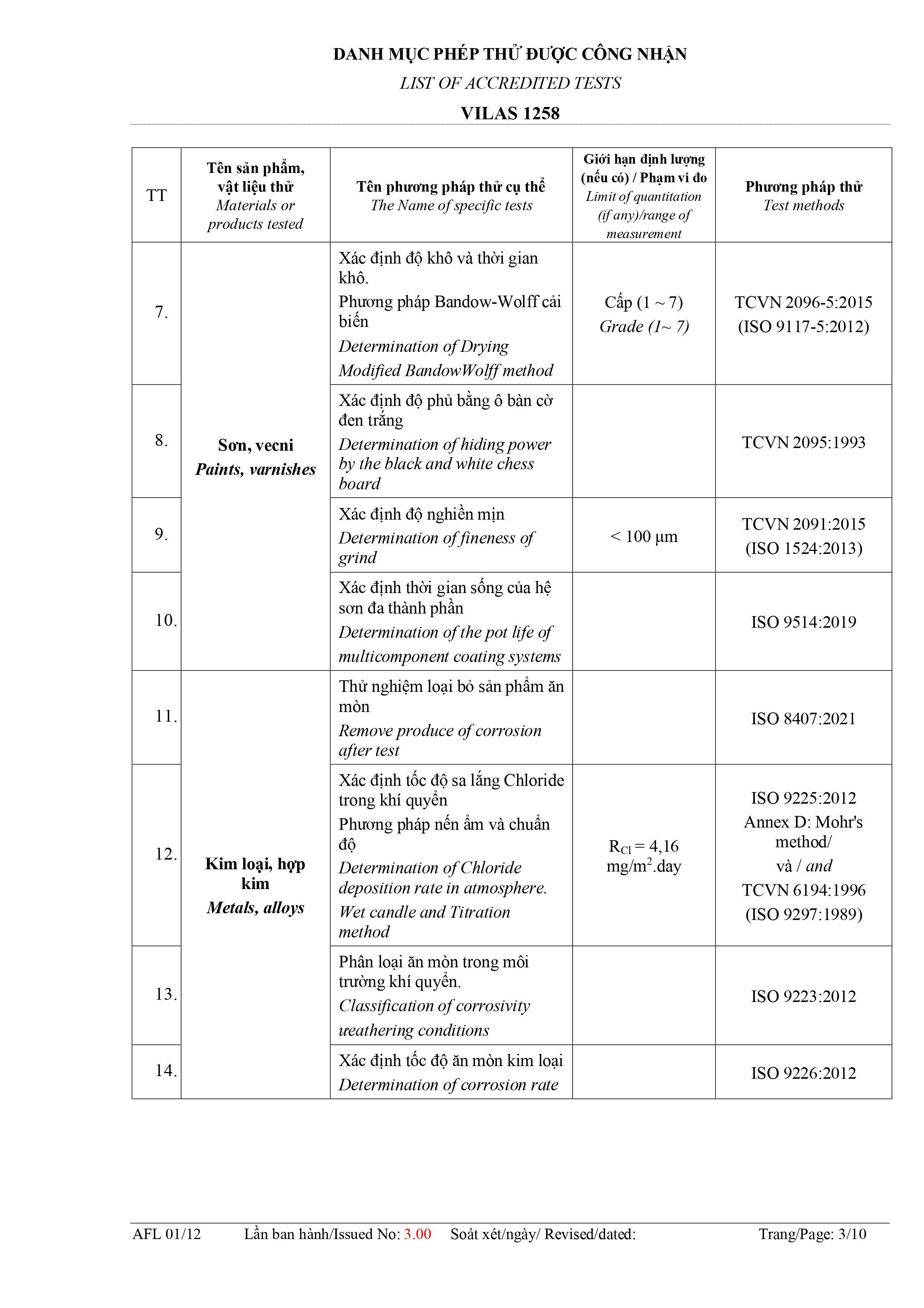 Danh mục phép thử được công nhận: