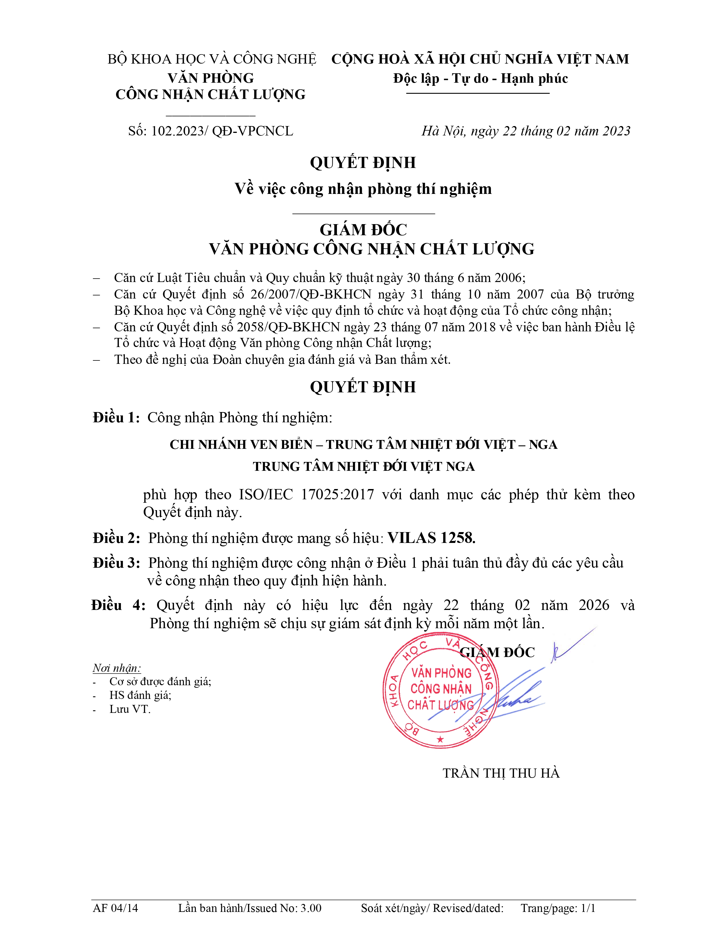 27/02/2023Các hoạt động thử nghiệm trên hướng vật liệu tại Chi nhánh Ven biển (CNVB) từ những ngày đầu thành lập đã hoạt động tuân thủ theo chuẩn TCVN/QS 877:2014 cho đến ngày nay. Với mục đích hội nhập và nâng cao chuẩn hóa các lĩnh vực, chỉ tiêu thử nghiệm, Phòng thí nghiệm CNVB đã tập trung đầu tư đào tạo, huấn luyện nhận thức về ISO/IEC 17025:2017; tổ chức đào tạo cán bộ, xây dựng hệ thống quản lý, các văn bản, tài liệu đồng bộ. Theo đó, ngày 26 tháng 11 năm 2019, Giám đốc Văn phòng Công nhận Chất lượng (BoA), Bộ Khoa học và Công nghệ ra Quyết định và cấp Chứng chỉ công nhận Phòng thí nghiệm Chi nhánh Ven biển, Trung tâm Nhiệt đới Việt-Nga phù hợp theo ISO/IEC 17025:2017 với danh mục gồm 19 phép thử (mã số VILAS 1258).