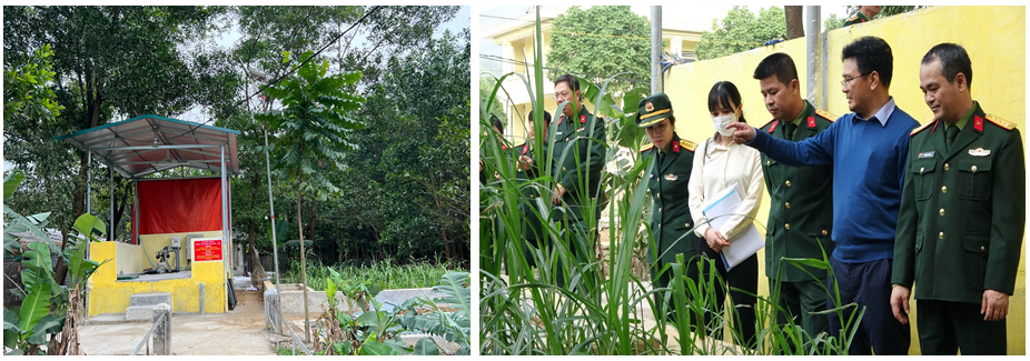 - Hệ thống xử lý nước thải chăn nuôi lợn của Tiểu đoàn quy mô 10 - 15 m3/ngày đêm xử lý thông qua 2 công đoạn: Xử lý qua bể xử lý sinh học kết hợp và bãi lọc trồng cây nhân tạo. Sau 3 tháng vận hành, hệ thống hoạt động ổn định, cây cỏ voi phát triển tốt, nước thải đầu ra đạt cột B QCVN 62:2016/BTNMT về nước thải chăn nuôi. Nước sau xử lý được sử dụng làm nước tưới cho hoạt động tăng gia trồng trọt tại đơn vị, tiết kiệm đáng kể nguồn nước sạch sử dụng cho sinh hoạt.