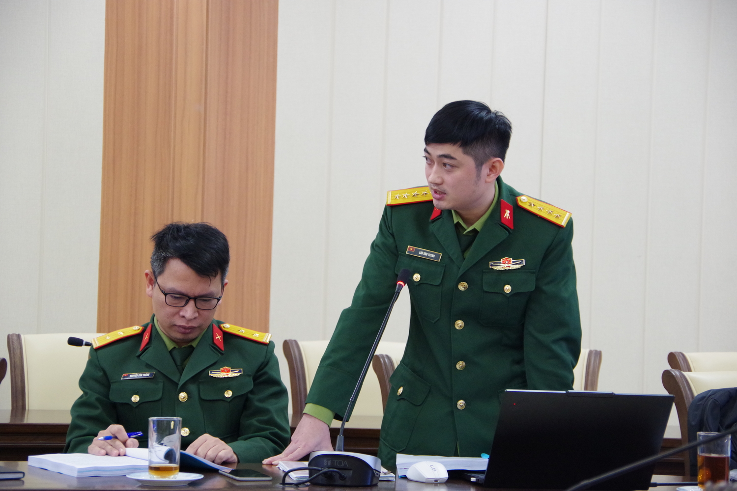 Thượng tá, TS. Nguyễn Trọng Dân, Chủ tịch Hội đồng, chủ trì phiên họp. Tham gia phiên họp có các thành viên Hội đồng, đại diện cơ quan quản lý khoa học, đơn vị chủ trì và nhóm nghiên cứu thực hiện nhiệm vụ.