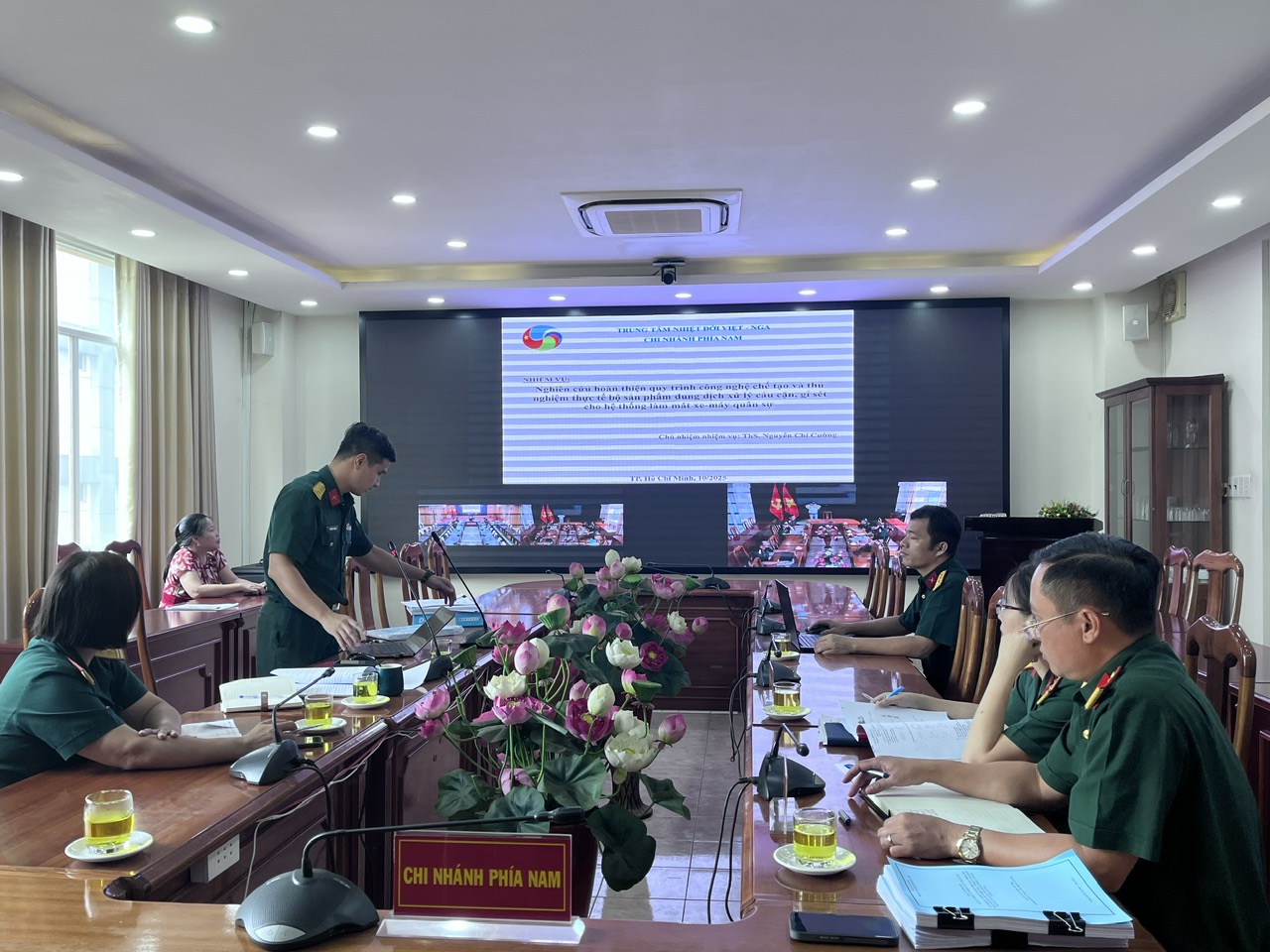 25/10/2025Sáng ngày 24 tháng 10, Trung tâm Nhiệt đới Việt - Nga (Trung tâm) tổ chức họp Hội đồng Khoa học và Công nghệ (KH&CN) tư vấn, đánh giá, nghiệm thu kết quả nhiệm vụ cấp Trung tâm: “Nghiên cứu hoàn thiện quy trình công nghệ chế tạo và thử nghiệm thực tế bộ sản phẩm dung dịch xử lý cáu cặn, gỉ sét cho hệ thống làm mát xe-máy quân sự”. Nhiệm vụ do Chi nhánh Phía Nam chủ trì, Trung tá, ThS. Nguyễn Chí Cường là chủ nhiệm. Phiên họp diễn ra theo hình thức trực tuyến giữa hai điểm cầu: Cơ sở chính tại Hà Nội và Chi nhánh Phía Nam tại TP. Hồ Chí Minh.