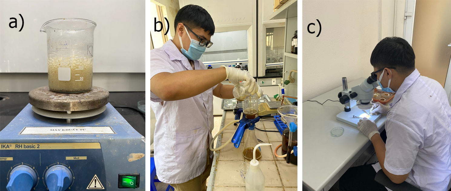 (a) Phân hủy chất hữu cơ có trong mẫu; (b) Lọc chân không sau khi tách tỷ trọng;