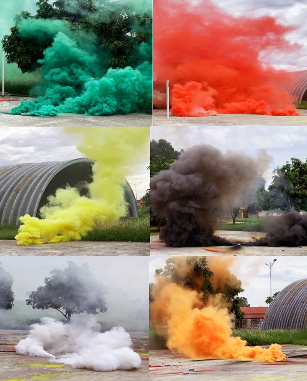 Để phục vụ yêu cầu huấn luyện, diễn tập với các tình huống khác nhau khói màu thường được sử dụng để thể hiện các ký tín hiệu hiệp đồng, Ví dụ như: khói vàng - phục vụ cho các mục đích diễn tập chống bạo loạn, ứng cứu xử lý các sự cố hóa học; khói da cam - diễn tập ứng cứu xử lý các sự cố về hạt nhân, khói đỏ - diễn tập ứng cứu xử lý các sự cố nguy hiểm cao đặc biệt; khói xanh - báo yên hết tình huống, khói đen - mô phỏng đám cháy giả, dành cho lực lượng PCCC. Viện Độ bền nhiệt đới/TTNĐ Việt-Nga đã nghiên cứu chế tạo và thử nghiệm bộ sản phẩm hộp phát khói màu với 06 màu: trắng, đen, xanh, đỏ, vàng, da cam dựa trên nền hệ tạo khói mới.