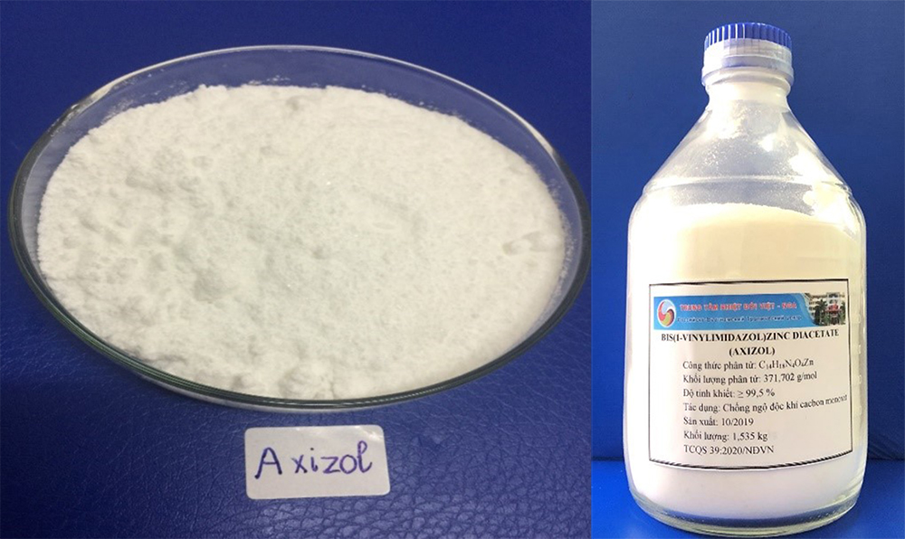 Kết quả nghiên cứu của đề tài đã xây dựng quy trình tổng hợp và tinh chế hoạt chất bis(1-vinylimidazol) kẽm axetat (axizol) có khả năng ứng dụng ở quy mô lớn. Nguyên liệu axizol thu nhận được có độ tinh khiết cao ≥ 99% và đã xác định được độc tính (độc tính cấp và bán trường diễn) của nguyên liệu. Đây là nghiên cứu đầu tiên ở Việt Nam đưa ra quy trình tổng hợp và thu nhận nguyên liệu axizol từ imidazol để ứng dụng trong sản xuất thuốc phòng chống nhiễm độc khí CO.