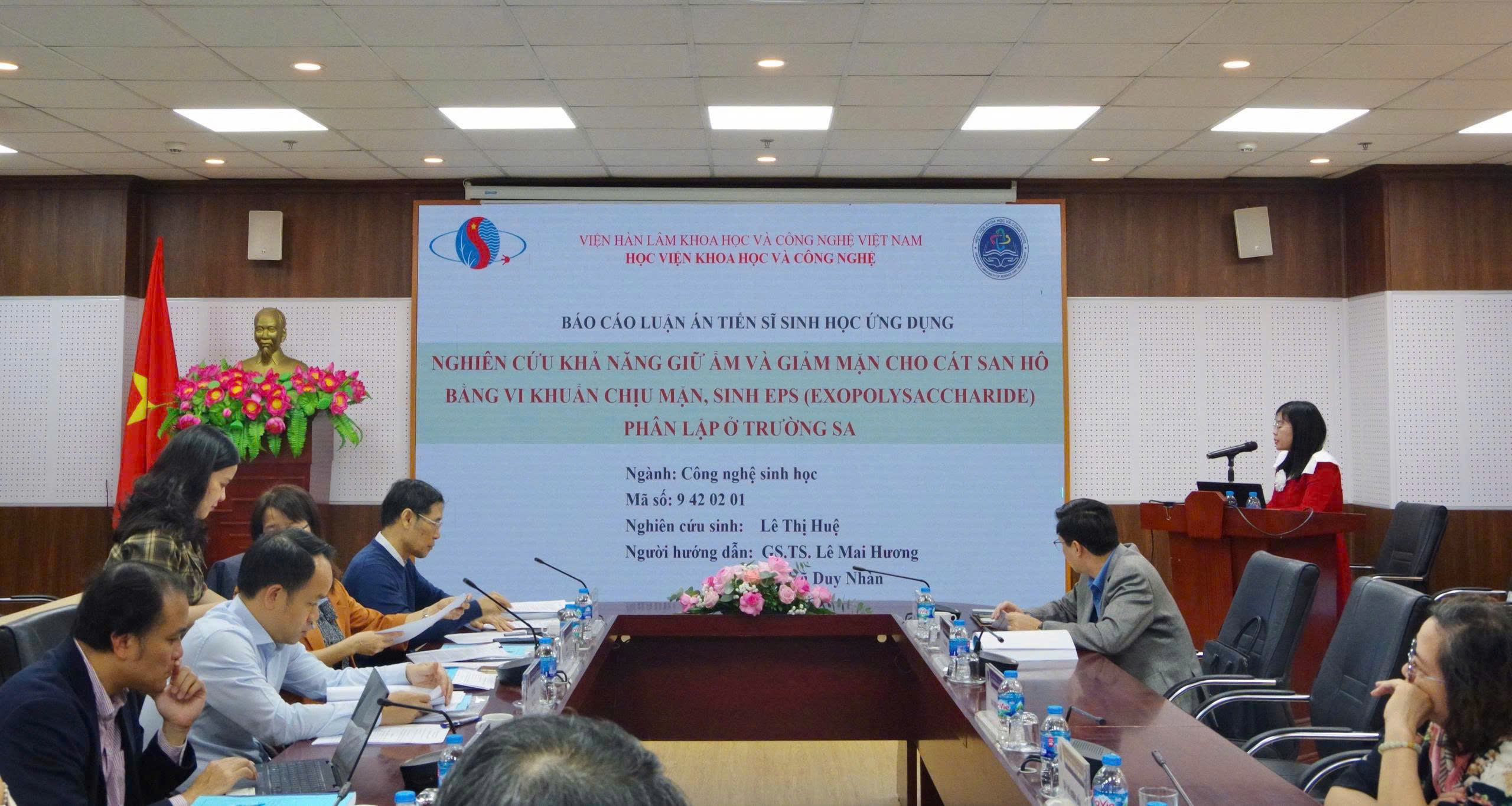 Tiếp đó, NCS Lê Thị Huệ đã trình bày báo cáo tóm tắt luận án trước Hội đồng, trong đó làm rõ cơ sở khoa học, mục tiêu, nội dung và phương pháp nghiên cứu. Báo cáo đồng thời nhấn mạnh những kết quả chính và các đóng góp mới của luận án trong việc nghiên cứu, ứng dụng vi khuẩn chịu mặn sinh EPS nhằm nâng cao khả năng giữ ẩm và giảm mặn cho cát san hô tại khu vực Trường Sa. Theo đó, nghiên cứu đã: