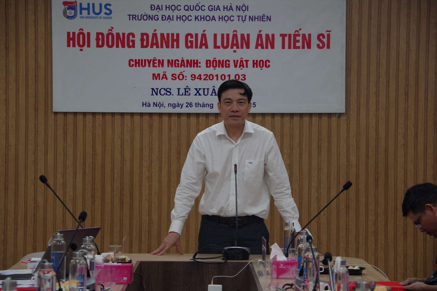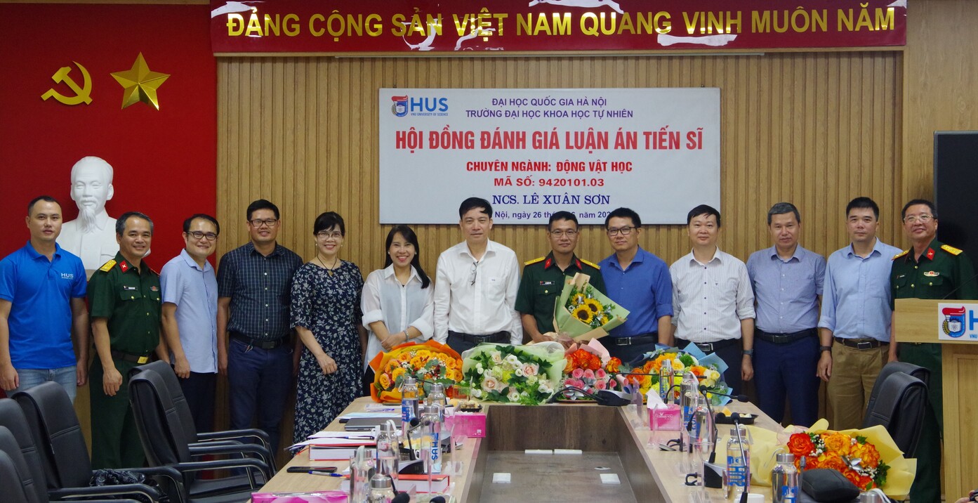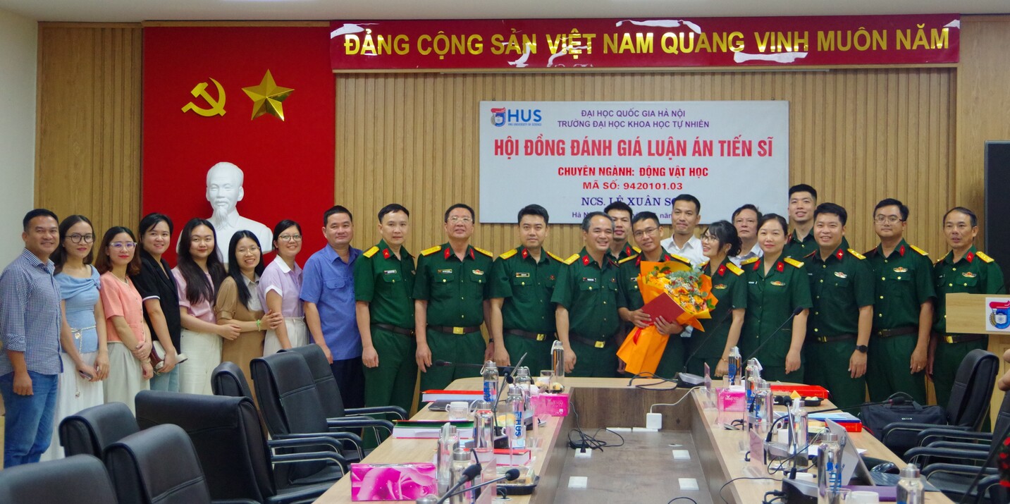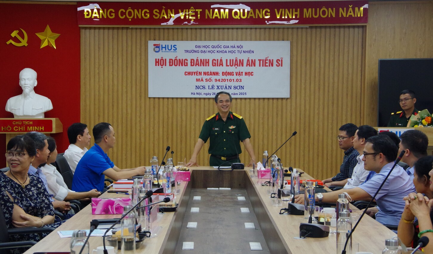 26/06/2025Sáng ngày 26/6, tại Trường Đại học Khoa học Tự nhiên/Đại học Quốc gia Hà Nội, diễn ra buổi họp Hội đồng đánh giá luận án tiến sĩ cấp Đại học Quốc gia cho nghiên cứu sinh (NCS) Lê Xuân Sơn/Viện Sinh thái nhiệt đới/Trung tâm Nhiệt đới Việt - Nga với đề tài “Nghiên cứu đa dạng thành phần loài và mối quan hệ di truyền của các loài trong bộ Rết lớn (Myriapoda: Chilopoda: Scolopendromorpha) ở Việt Nam”. Đề tài thuộc chuyên ngành Động vật học, mã số 9420101.03, được thực hiện dưới sự hướng dẫn của PGS. TS. Nguyễn Đức Anh và PGS. TS. Nguyễn Thành Nam.