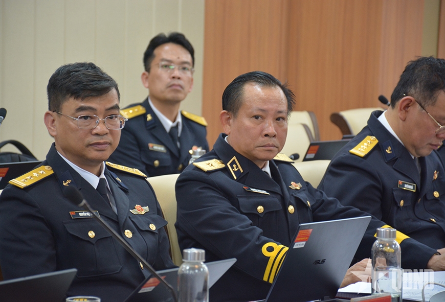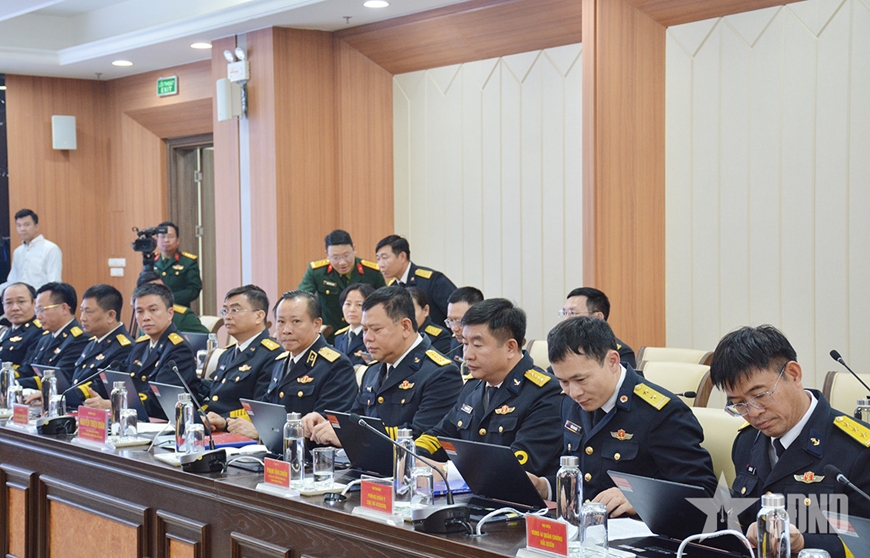 Chuẩn đô đốc Nguyễn Thiên Quân, Phó tham mưu trưởng Bộ Tham mưu Quân chủng Hải quân (giữa) đồng chủ trì hội nghị.