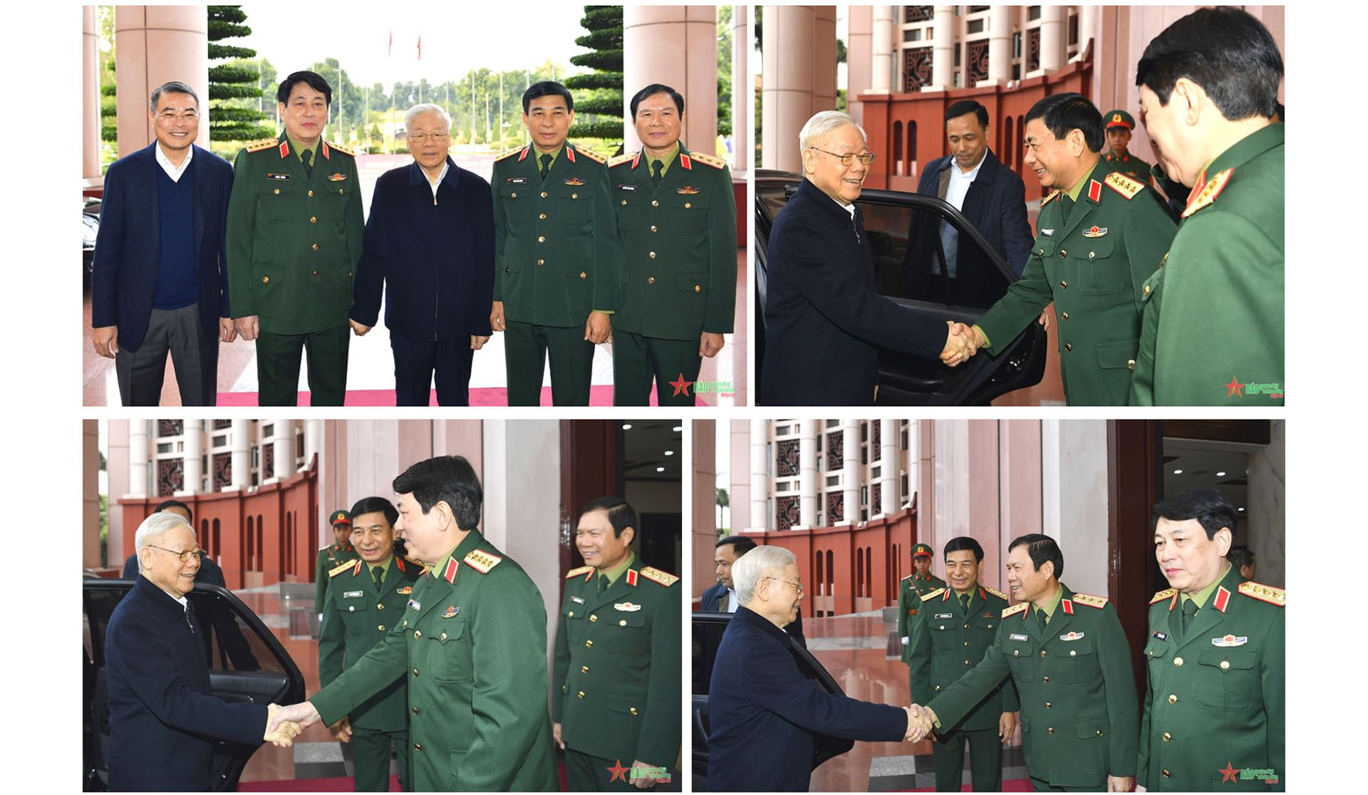 Các đồng chí lãnh đạo Quân ủy Trung ương, Bộ Quốc phòng đón Tổng Bí thư Nguyễn Phú Trọng, Bí thư Quân ủy Trung ương (sáng 25-12-2023).