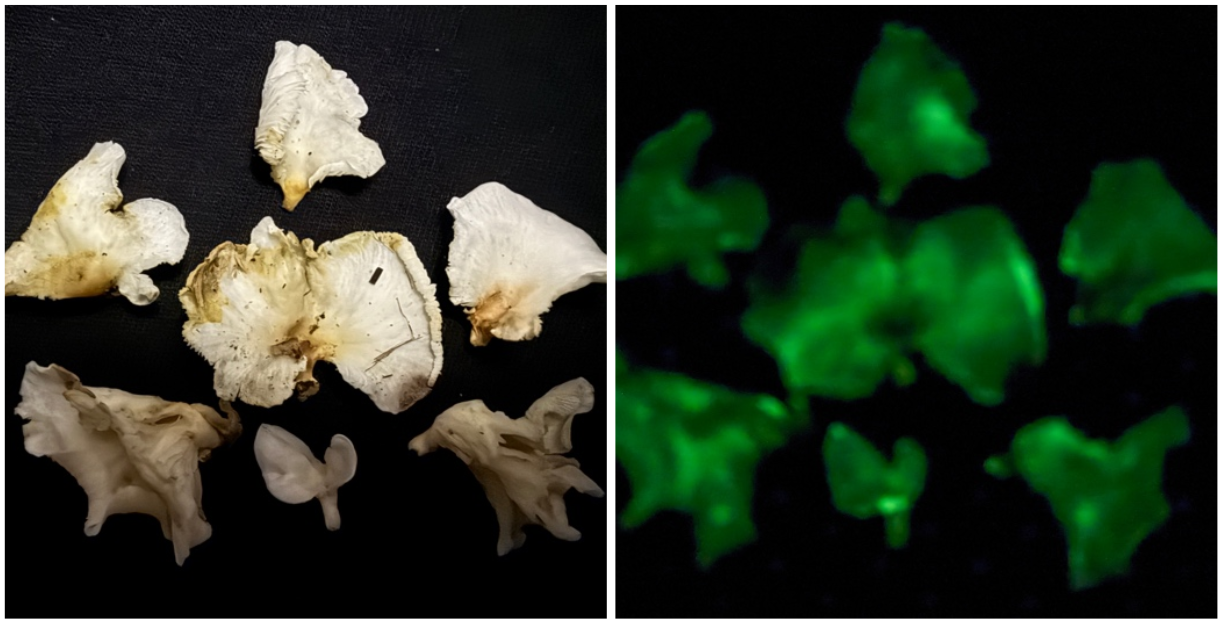 Nấm Neonothopanus nambi trong tối có chiếu đèn và tối hoàn toàn.