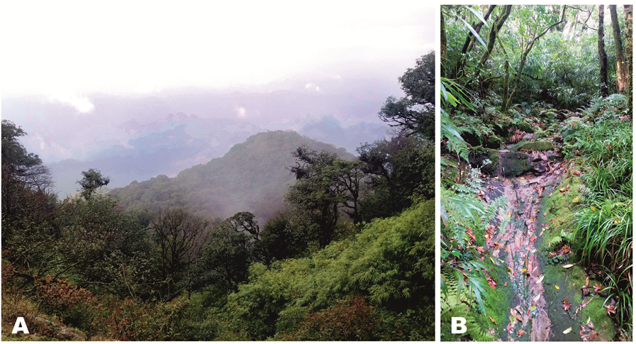 A - Ảnh toàn cảnh, B - Ảnh địa điểm ghi nhận loài (Ảnh: Lê Xuân Sơn).