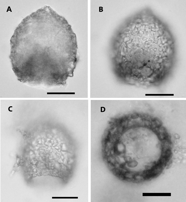 Hình ảnh loài mới Difflugia vietnamica được quan sát dưới kính hiển vi quang học. A-C: nhìn từ phía bên. D: nhìn từ phía lỗ miệng. Thang đo: 20 µm